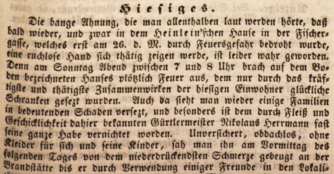 | Beschreibung | Schon wieder Feuer bei Heinlein in der oberen Fischergasse, November 1841 | ||