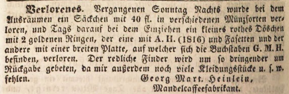 | Dateiinfo (Bild-Unterschrift und Info-Box, automatisch erstellt) | Zeitungsanzeige von Georg Martin Heinlein in der oberen Fischergasse, November 1841 Lizenz: NoC-NC 1.0 | ||
