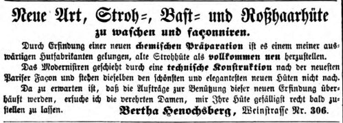 | Dateiinfo (Bild-Unterschrift und Info-Box, automatisch erstellt) | Zeitungsannonce von Bertha Henochsberg, März 1857 Lizenz: NoC-NC 1.0 | ||