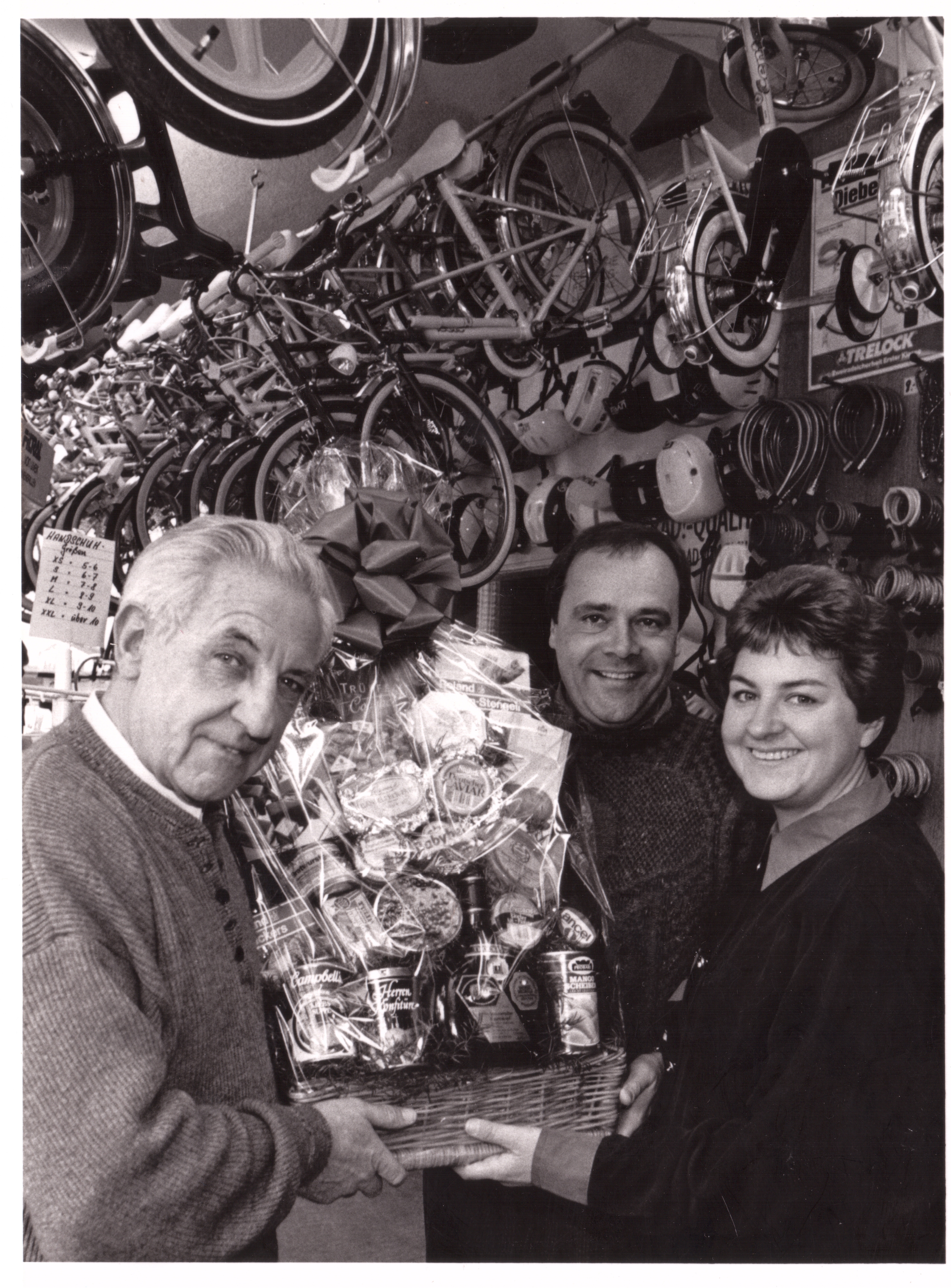 | Beschreibung | Ehrung des langjährigen Angestellten Hermann Purucker (links) zum 40-jährigen Dienstjubiläum bei Fahrrad-Hegendörfer. Rechts das damalige Inhaberehepaar Feichtenbeiner, 1992 | ||