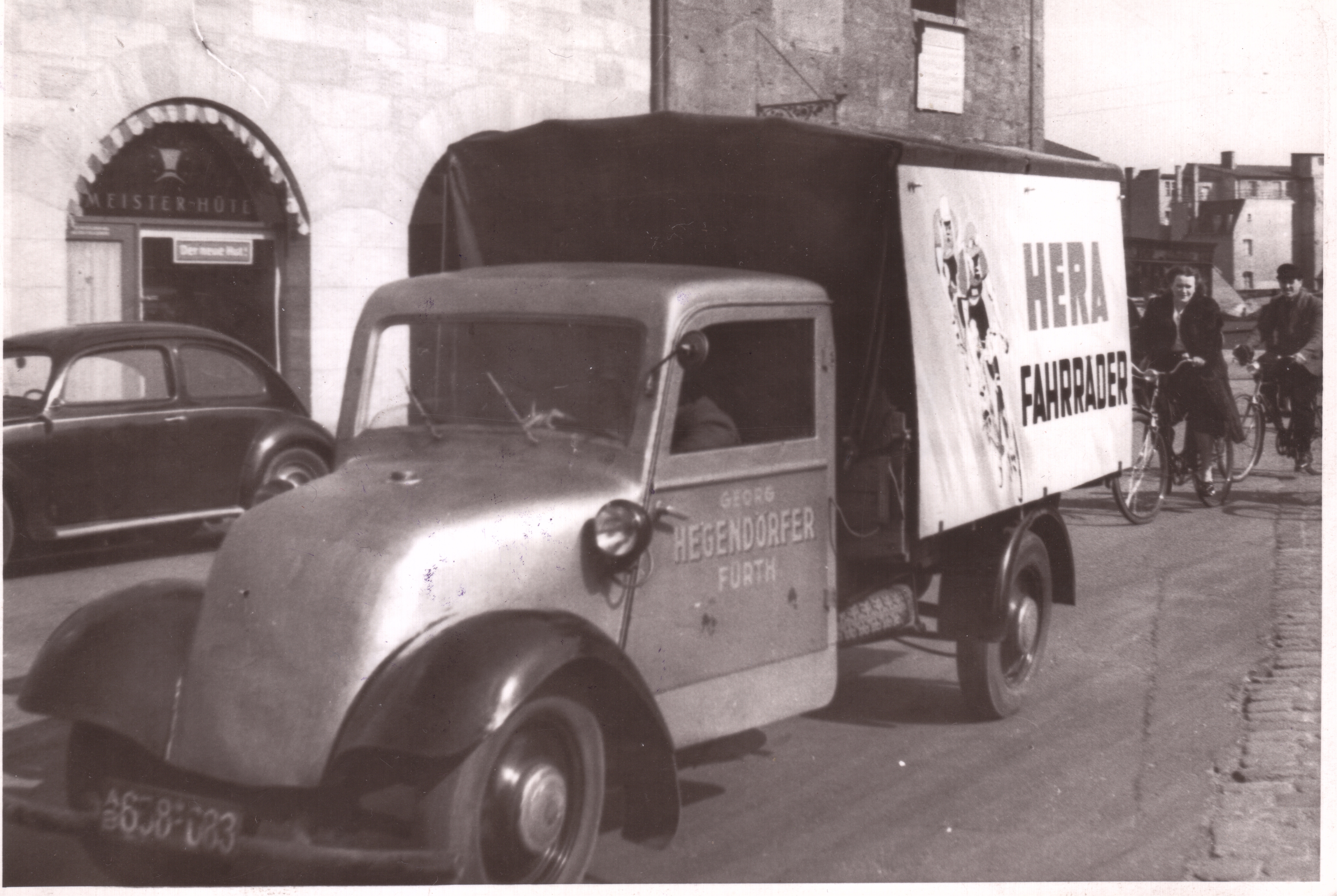 | Beschreibung | Hera-Lieferwagen im Einsatz, vermutlich in Nürnberg. 1950er Jahre | ||