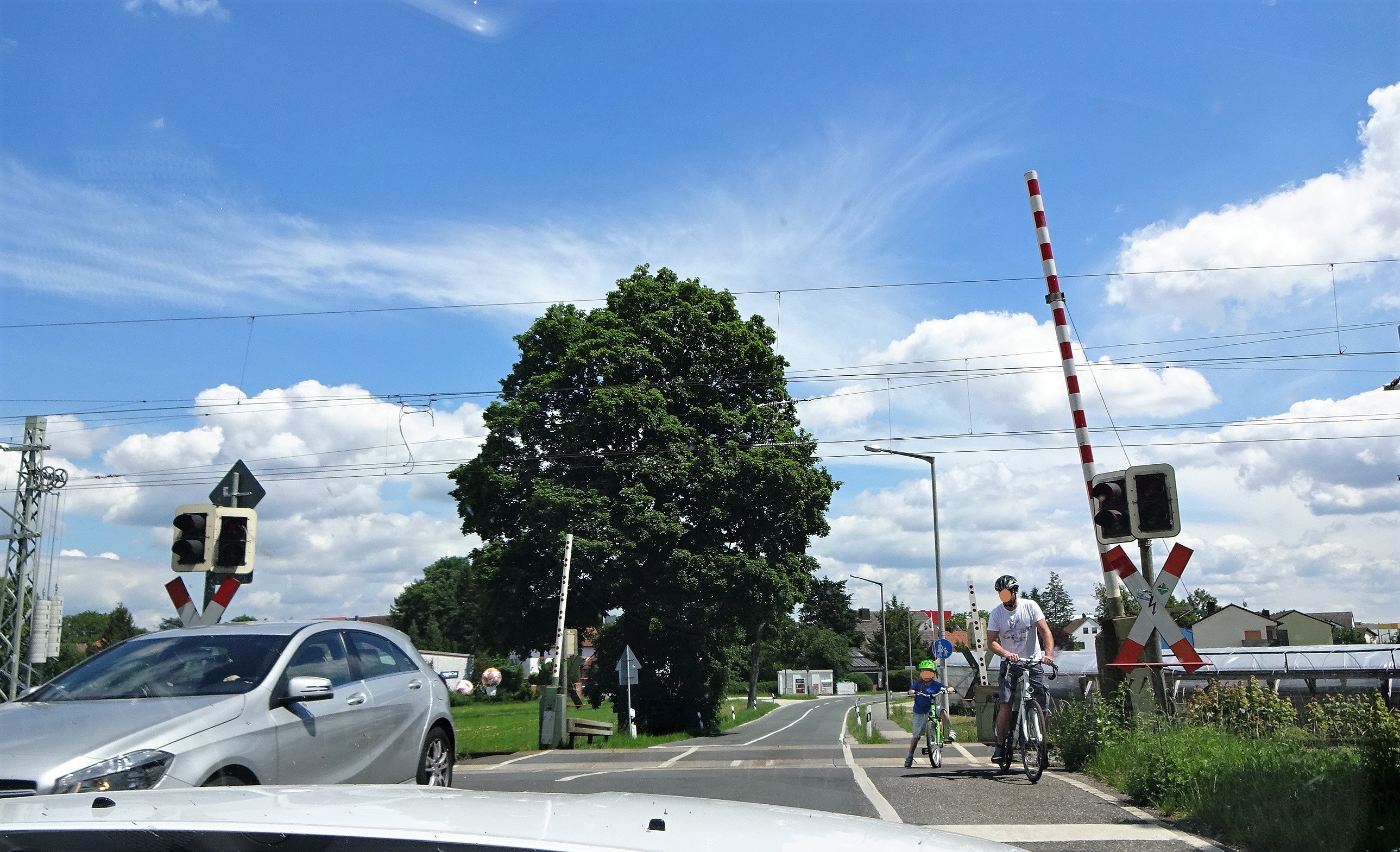 Beschrankter Bahnübergang Herboldshofer Straße Richtung Herboldshof im Juni 2020