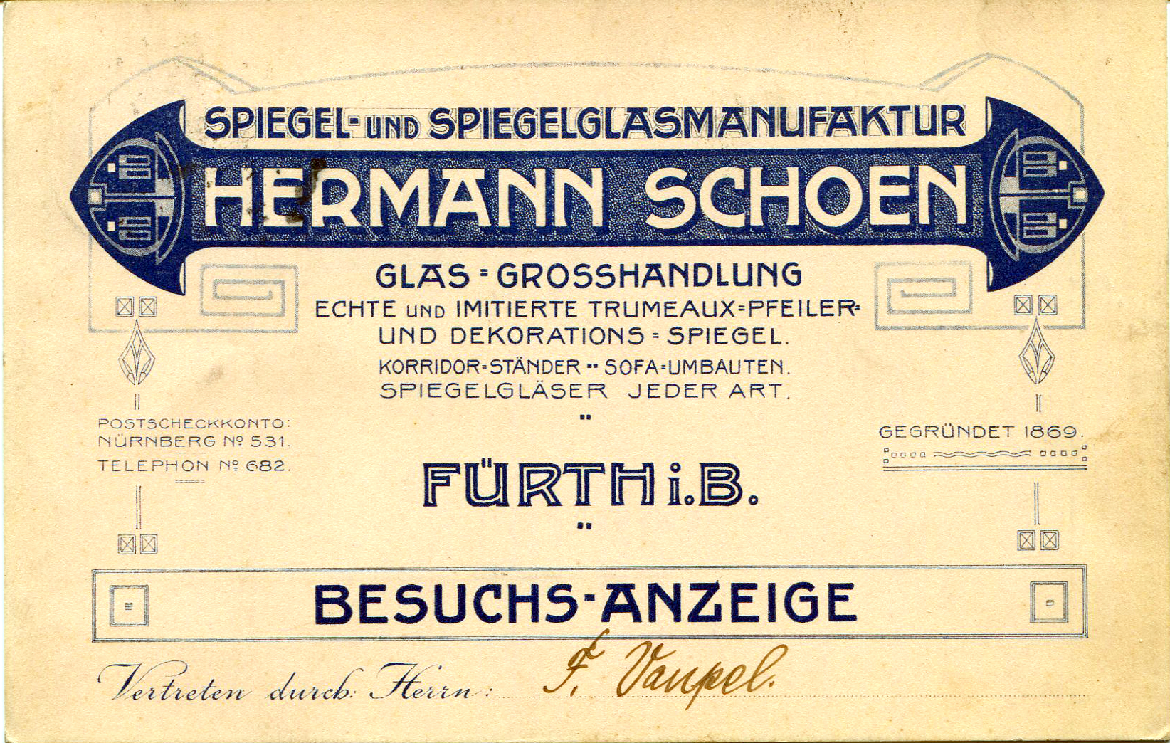 | Beschreibung | Besuchsanzeige der Spiegelfabrik Hermann Schoen, gel. 1913 | ||