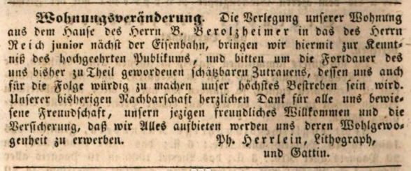 | Beschreibung | Zeitungsannonce des Litographen Philipp Herrlein, 1840 | ||