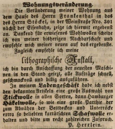 | Dateiinfo (Bild-Unterschrift und Info-Box, automatisch erstellt) | Zeitungsannonce des Lithographen Philipp Herrlein, Juni 1846 Lizenz: Out of copyright - non commercial re-use | ||