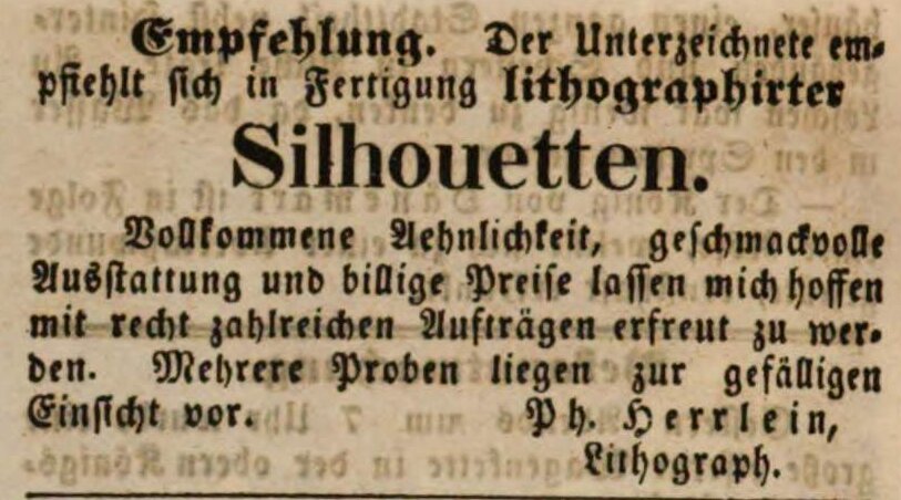 | Dateiinfo (Bild-Unterschrift und Info-Box, automatisch erstellt) | Zeitungsannonce des Lithographen Philipp Herrlein, Januar 1848 Lizenz: Out of copyright - non commercial re-use | ||