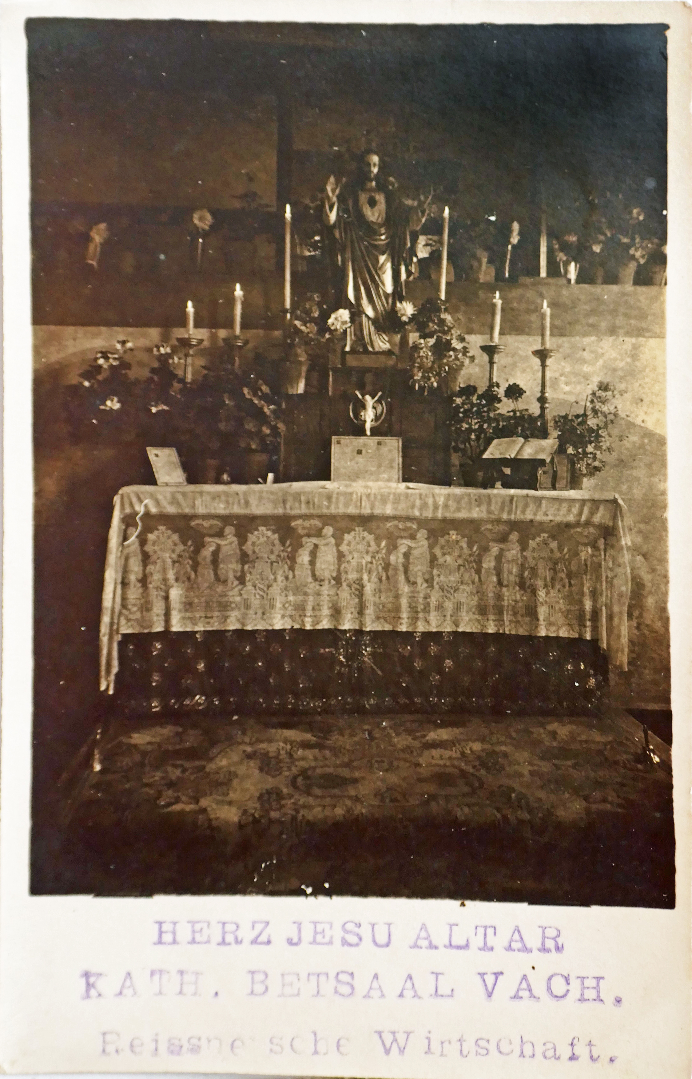 | Beschreibung | Altar des Betsaals der kath. Gemeinde im Gasthof Reißner-Egerer in Vach, 1927 | ||