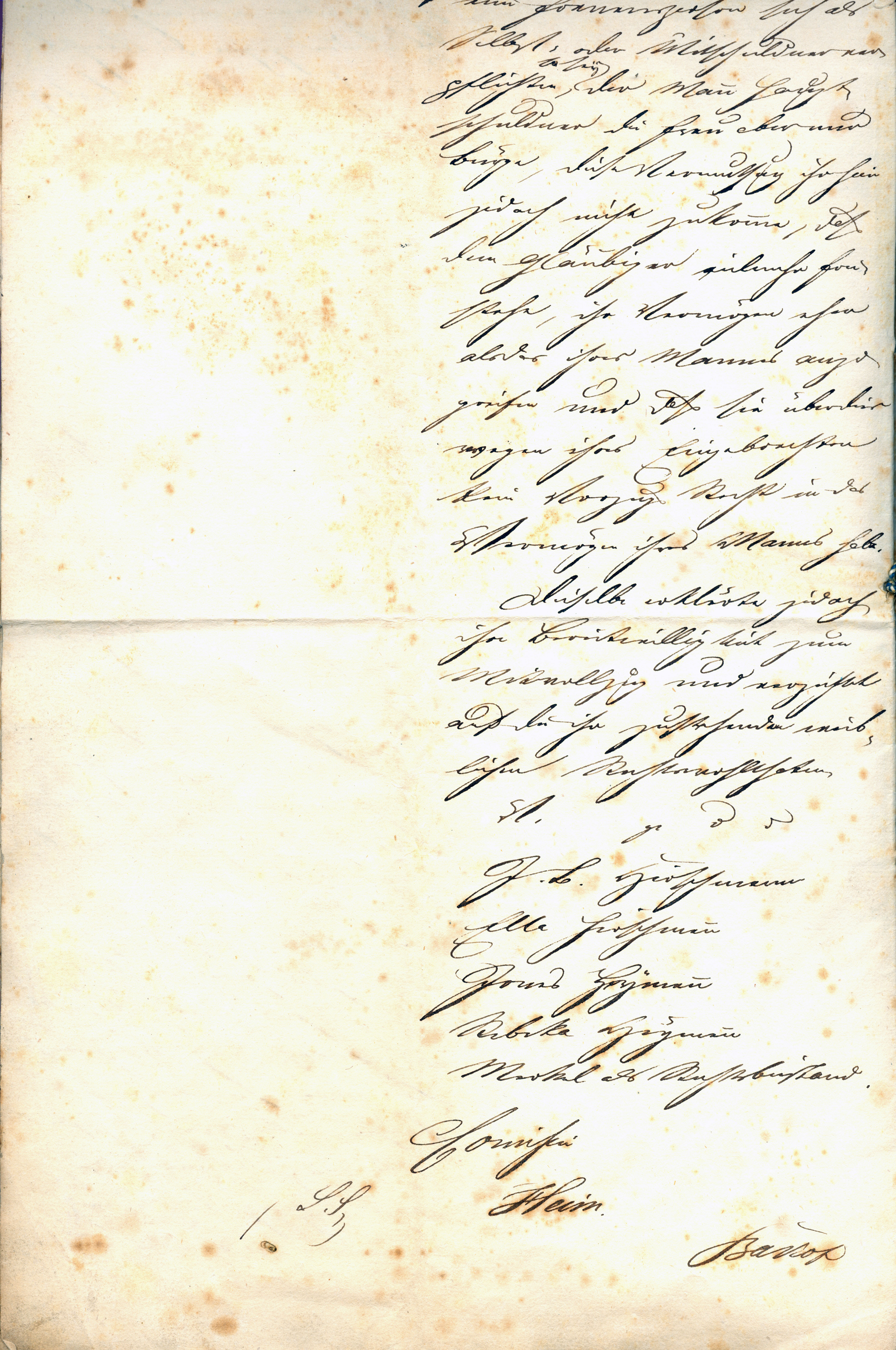 begründeten daß wenn in einem Dokumente eine Manns- nur zur Frauensperson sich als Selbst- oder Mitschuldner verpflichten, dafür ihr Mann Hauptschuldner, die Frau aber nur Bürge, diese Vermuthung ihr hierfür jedoch nicht zukomme, daß dem Gläubiger vielmehr freistehe, ihr Vermögen eher als das ihres Mannes anzugreifen und sie überdies wegen ihres Eingebrachten kein Vorzugs Recht in das Vermögen ihres Mannes habe. Dieselbe erklärte jedoch ihre Bereitwilligkeit zum Mitvollzug und verzichtet auf die ihr zustehenden weiblichen Rechtswehrschaften. V g u u Jakob Hirschmann Ella Hirschmann Jonas Heymann Rebecca Heymann Merkel als Rechtsbeistand Commissär Heim Bachof