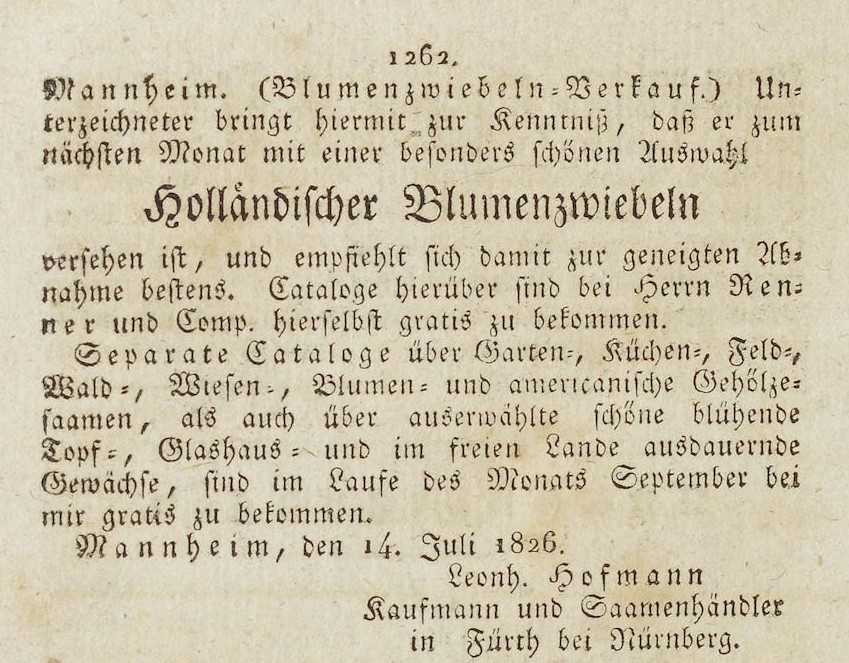 | Dateiinfo (Bild-Unterschrift und Info-Box, automatisch erstellt) | Werbeanzeige des Samenhändlers Leonhard Hofmann, Juli 1826 Lizenz: NoC-NC 1.0 | ||