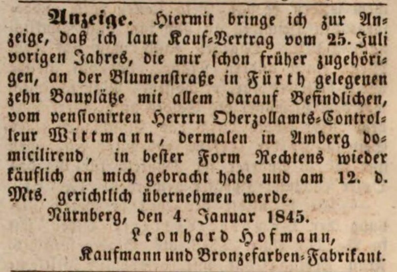 | Beschreibung | Zeitungsanzeige des Bronzefarbenfabrikanten Leonhard Hofmann, Jan. 1845 | ||