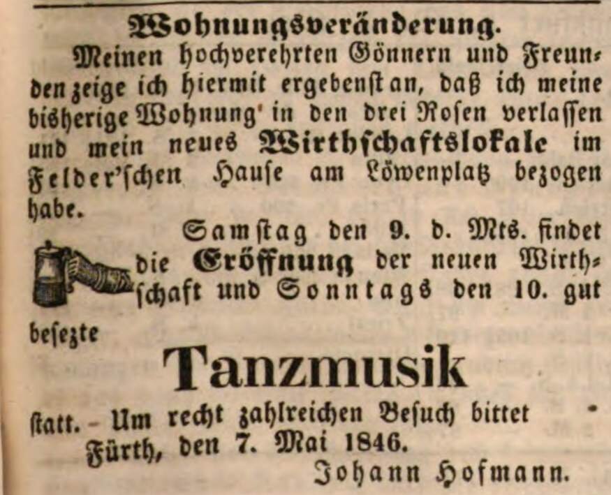 | Beschreibung | Johann Hofmann eröffnet seine Wirtschaft im Felder´schen Haus auf dem Löwenplatz, Mai 1848 | ||