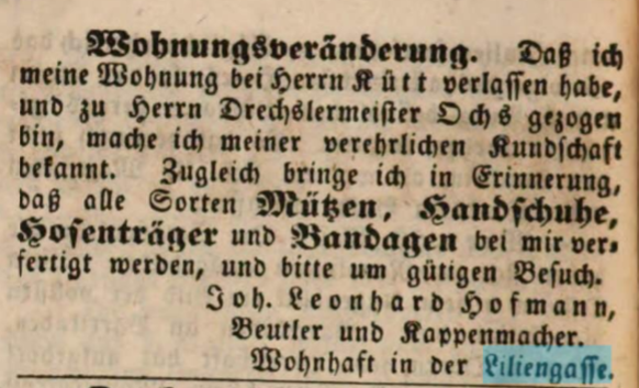 | Dateiinfo (Bild-Unterschrift und Info-Box, automatisch erstellt) | Zeitungsannonce des Beutlers J. L. Hofmann in der Liliengasse, Juni 1848 Lizenz: NoC-NC 1.0 | ||