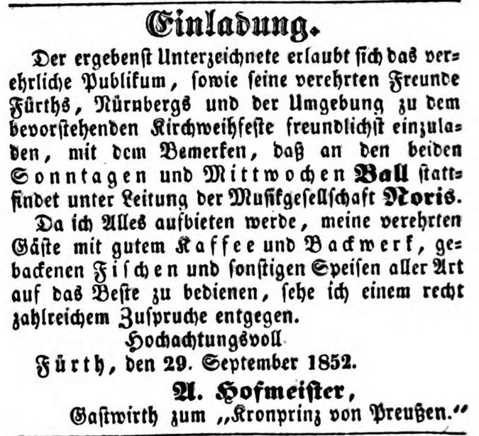 | Beschreibung | Zeitungsannonce des Wirts zum Kronprinzen von Preußen, Anton Hofmeister, Oktober 1852 | ||