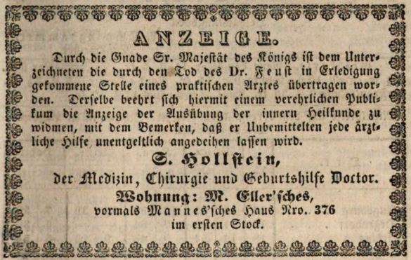 | Dateiinfo (Bild-Unterschrift und Info-Box, automatisch erstellt) | Zeitungsanzeige des neuen Arztes Simon Hollstein, Juni 1843 Lizenz: NoC-NC 1.0 | ||