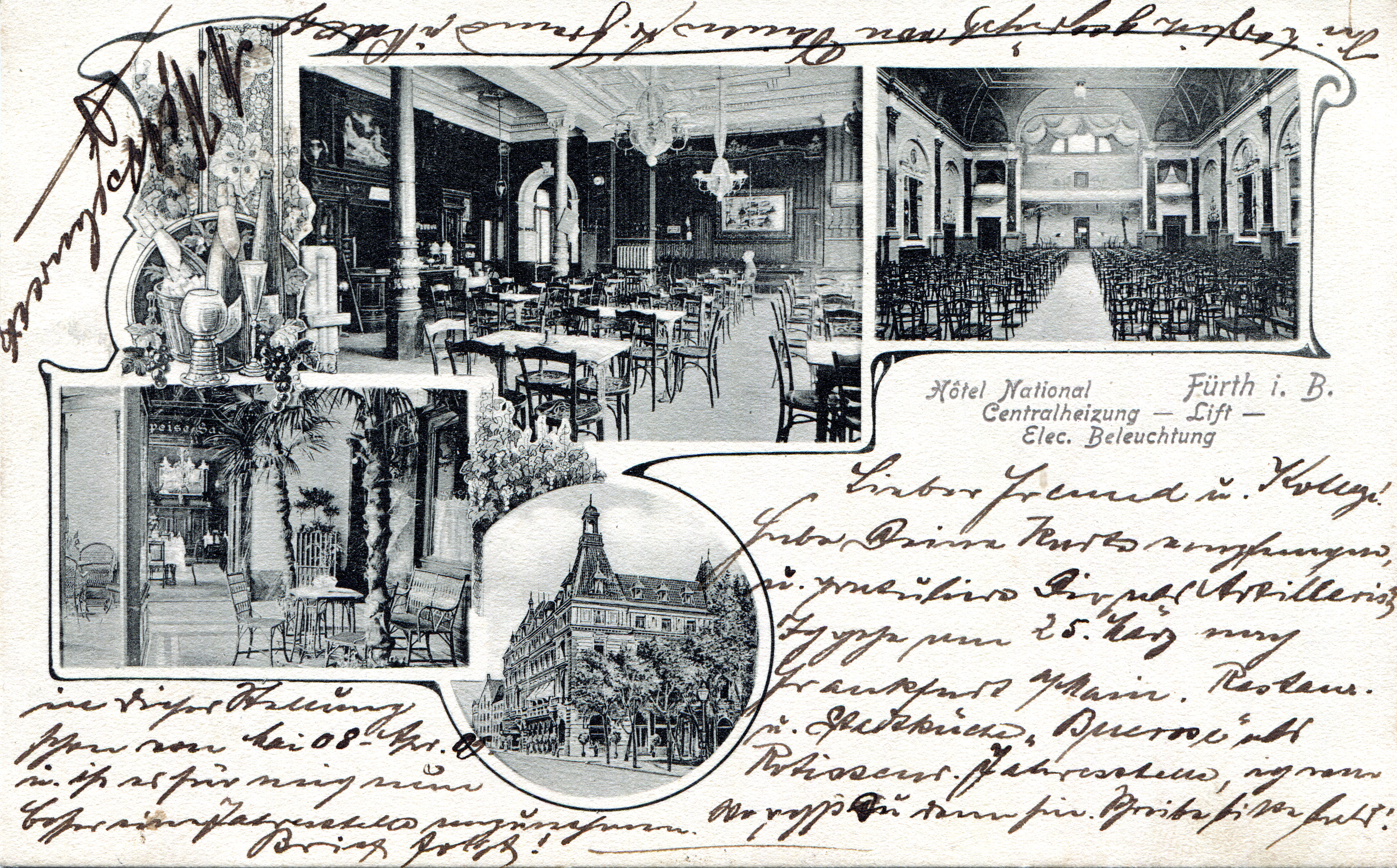 | Beschreibung | Ansichtskarte Hotel National - später Parkhotel - Ausschnitt mit dem Festsaal. Gelaufen 1911 | ||