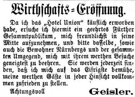 | Beschreibung | Zeitungsanzeige von Geisler, der das "Hotel Union" gekauft hat, Mai 1867 | ||