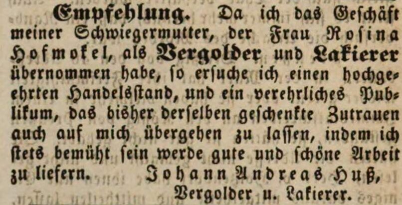 | Dateiinfo (Bild-Unterschrift und Info-Box, automatisch erstellt) | Zeitungsanzeige des Vergolders J. A. Huß, Januar 1848 Lizenz: NoC-NC 1.0 | ||