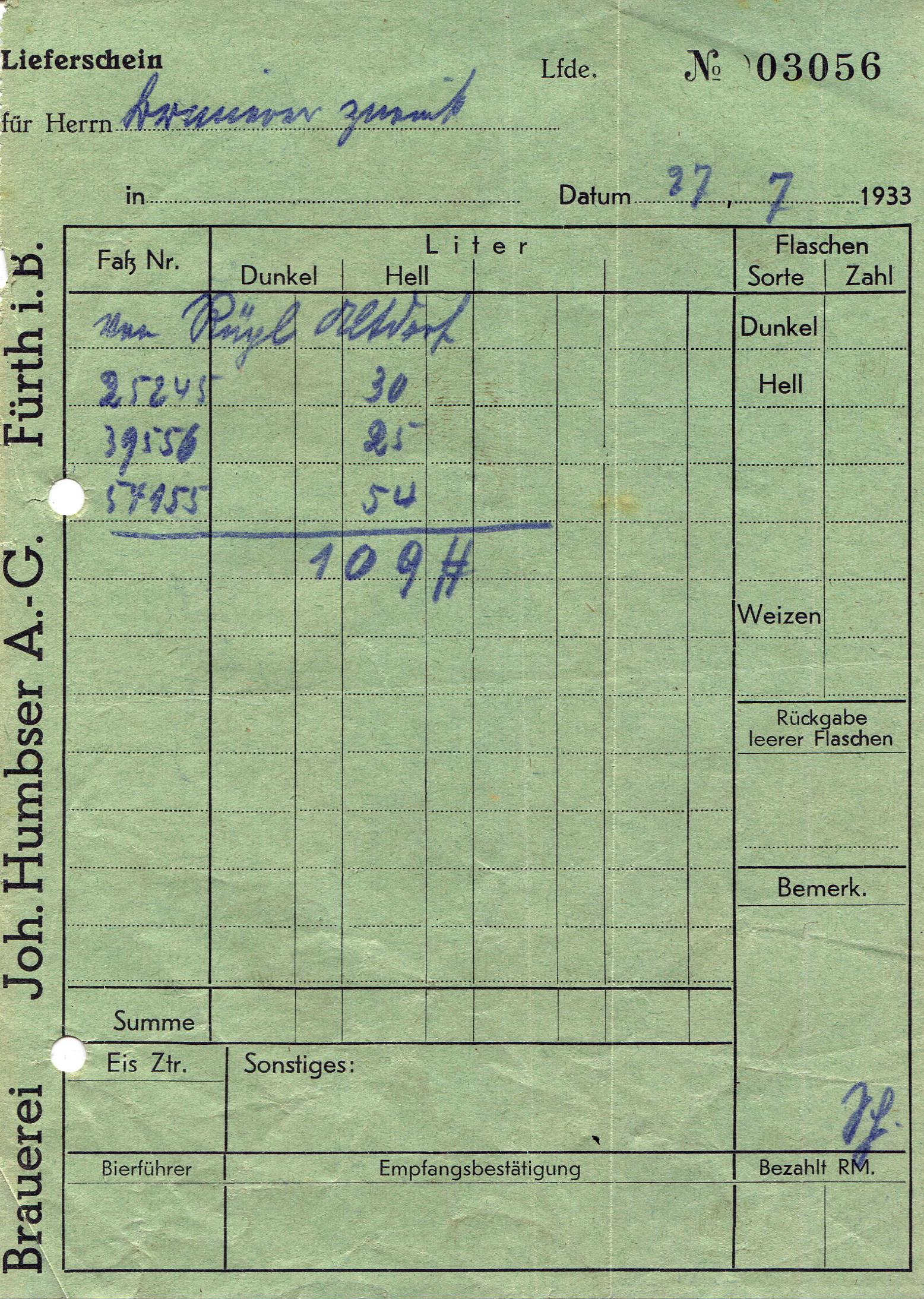 | Beschreibung | Lieferschein der Brauerei Humbser, 1935 | ||