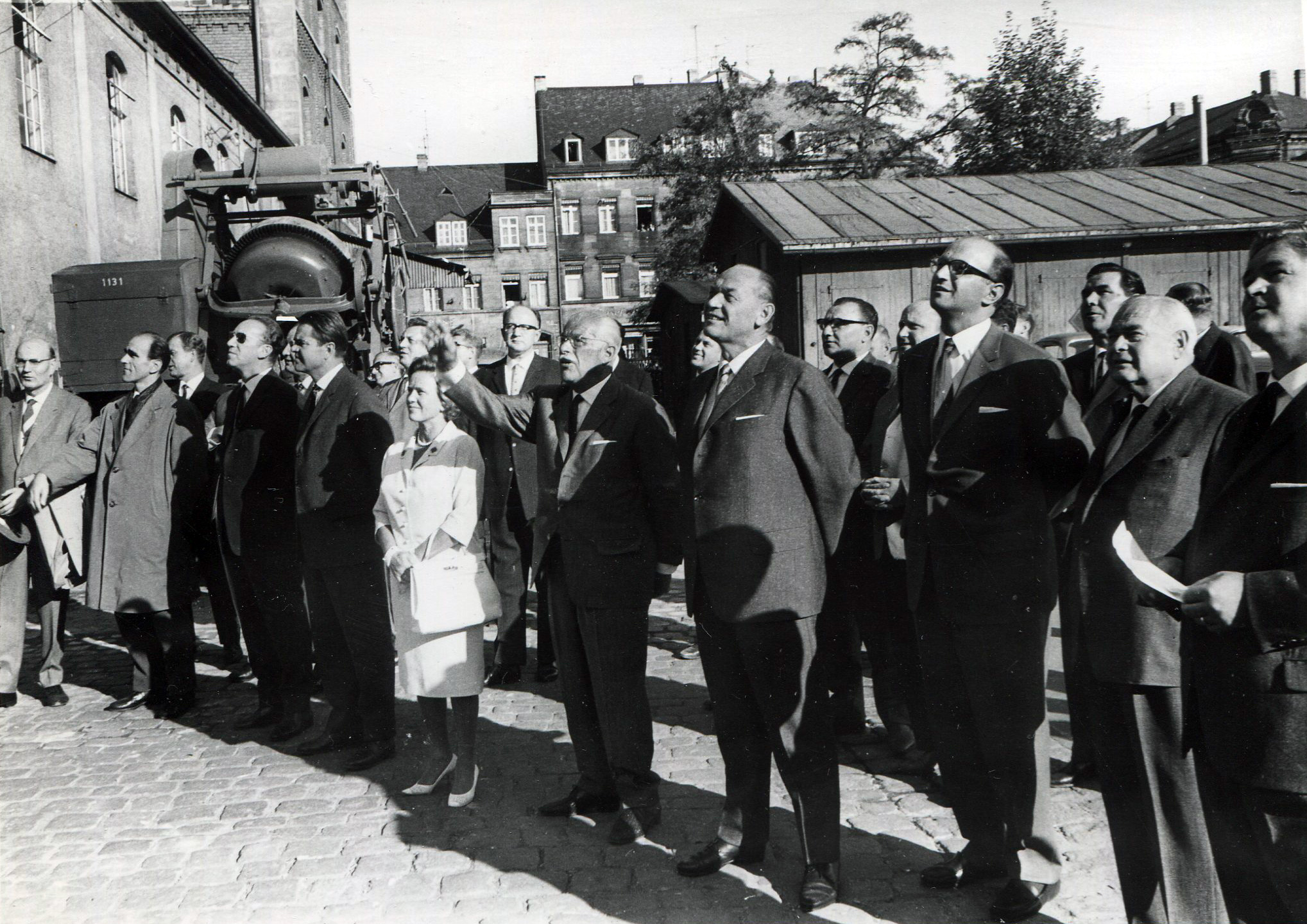 | Beschreibung | Grete und Gustav Schickedanz, Hans Dedi (links neben Grete) und Wolfgang Schneider (zweiter von links) mit den Brauereidirektoren Dr. Ulrich Ost (dritter von rechts) und Günther Dettenhofer (am rechten Bildrand) auf dem Gelände der Brauerei Humbser-Geismann, ca. 1970 | ||