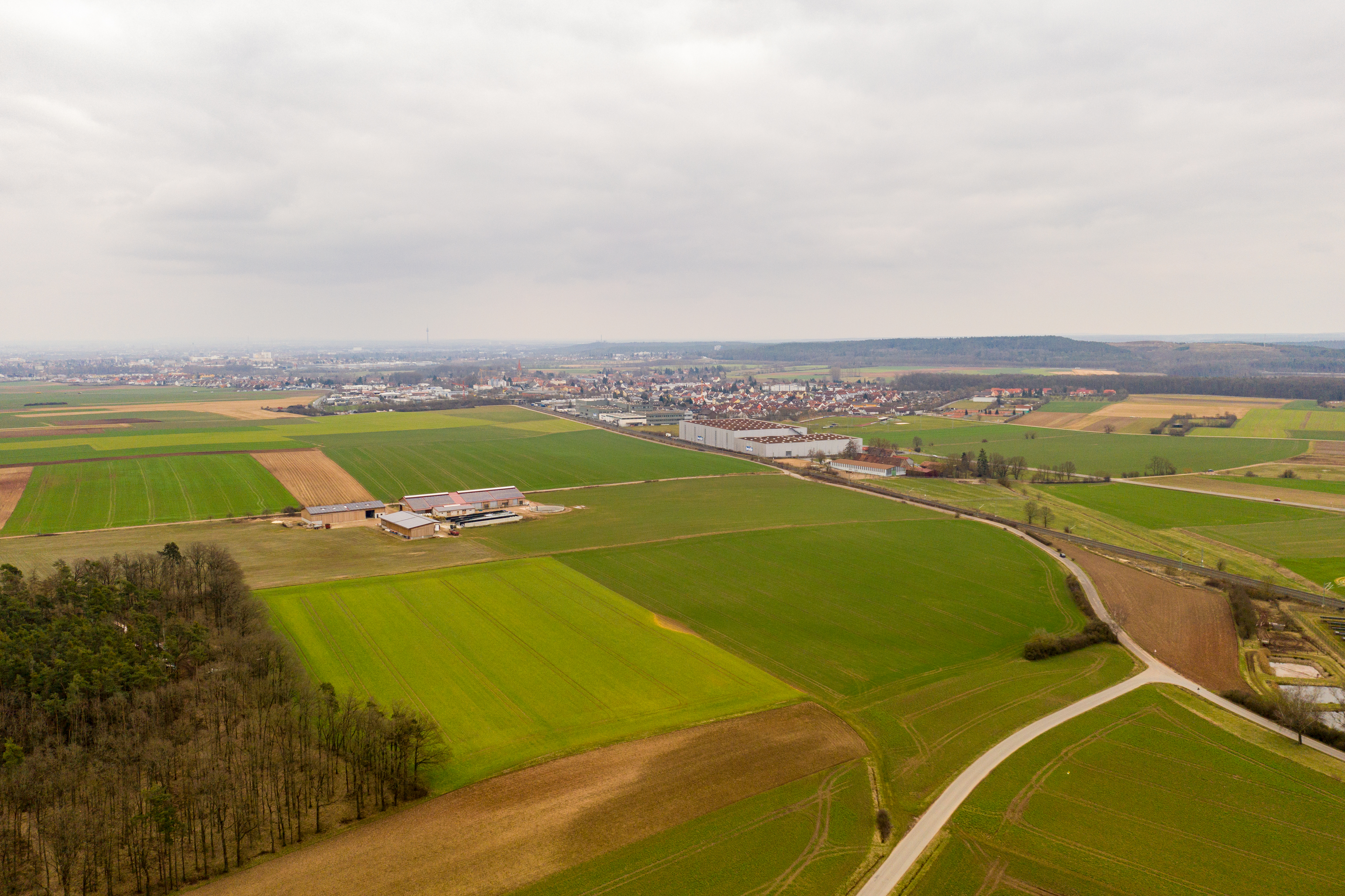 | Beschreibung | Mögliche Fläche für das geplante ICE-Werk Burgfarrnbach links der Schienen, im Hintergrund der Ort Burgfarrnbach bzw. Fürth, im Vordergrund an der Bahnstrecke Nürnberg – Würzburg die Firma Bruder, März 2021 | ||