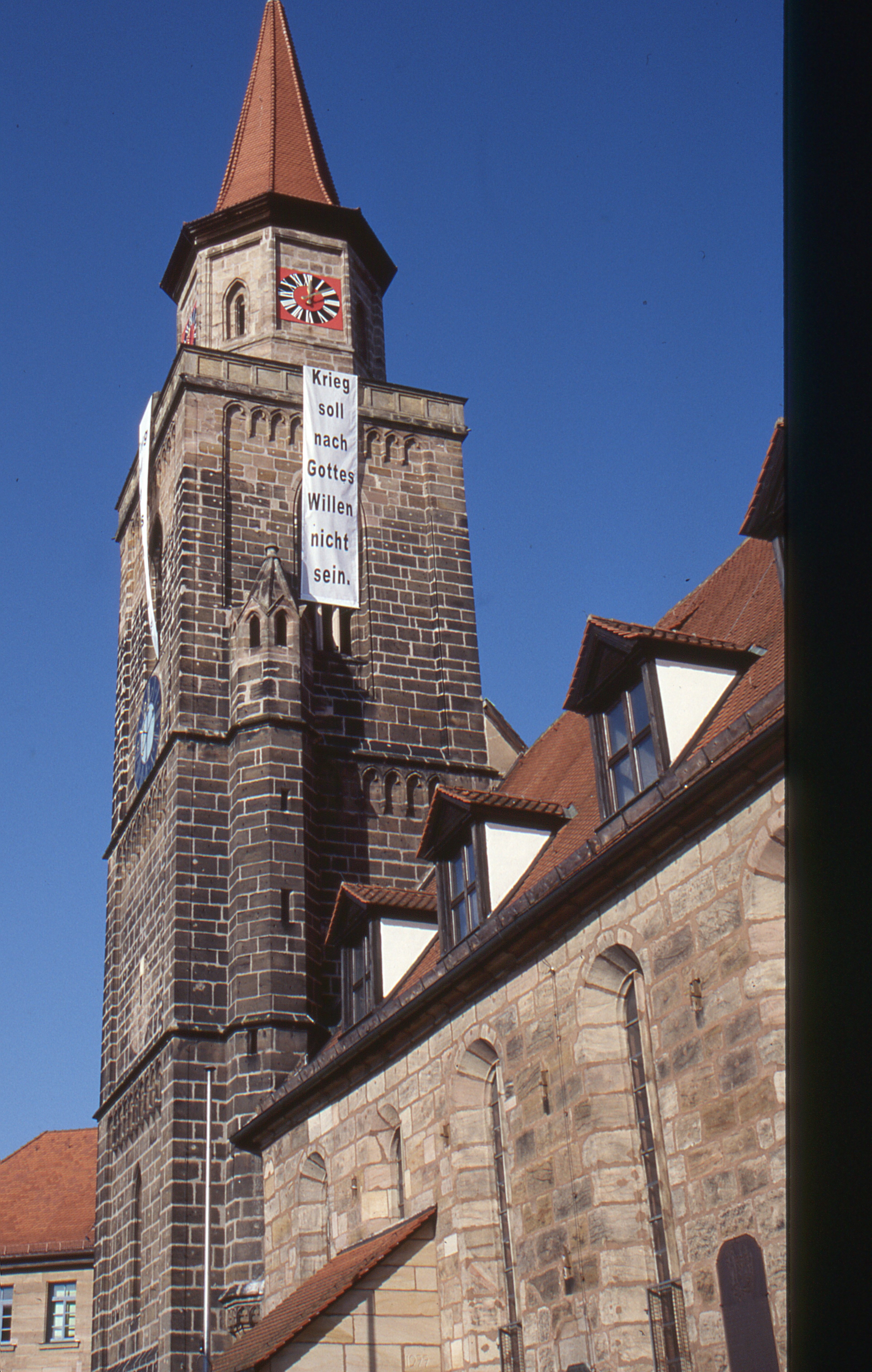 | Beschreibung | Kirchturm St. Michael im April oder Mai 2003 mit einem Spruchband anlässlich des Irakkrieges: "Krieg soll nach Gottes Willen nicht sein" | ||