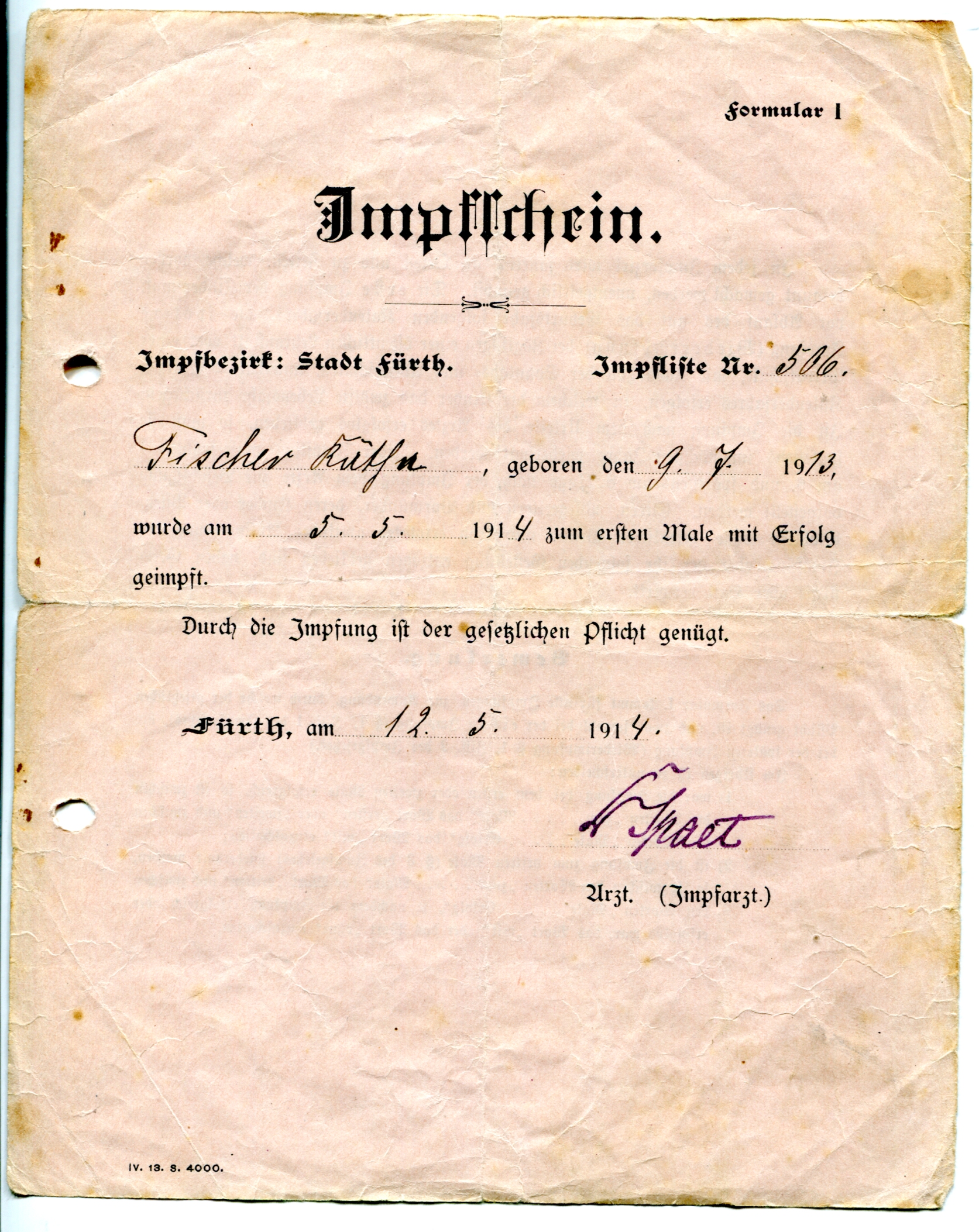 Impfschein Impfbezirk Stadt Fürth vom 12.5.1914