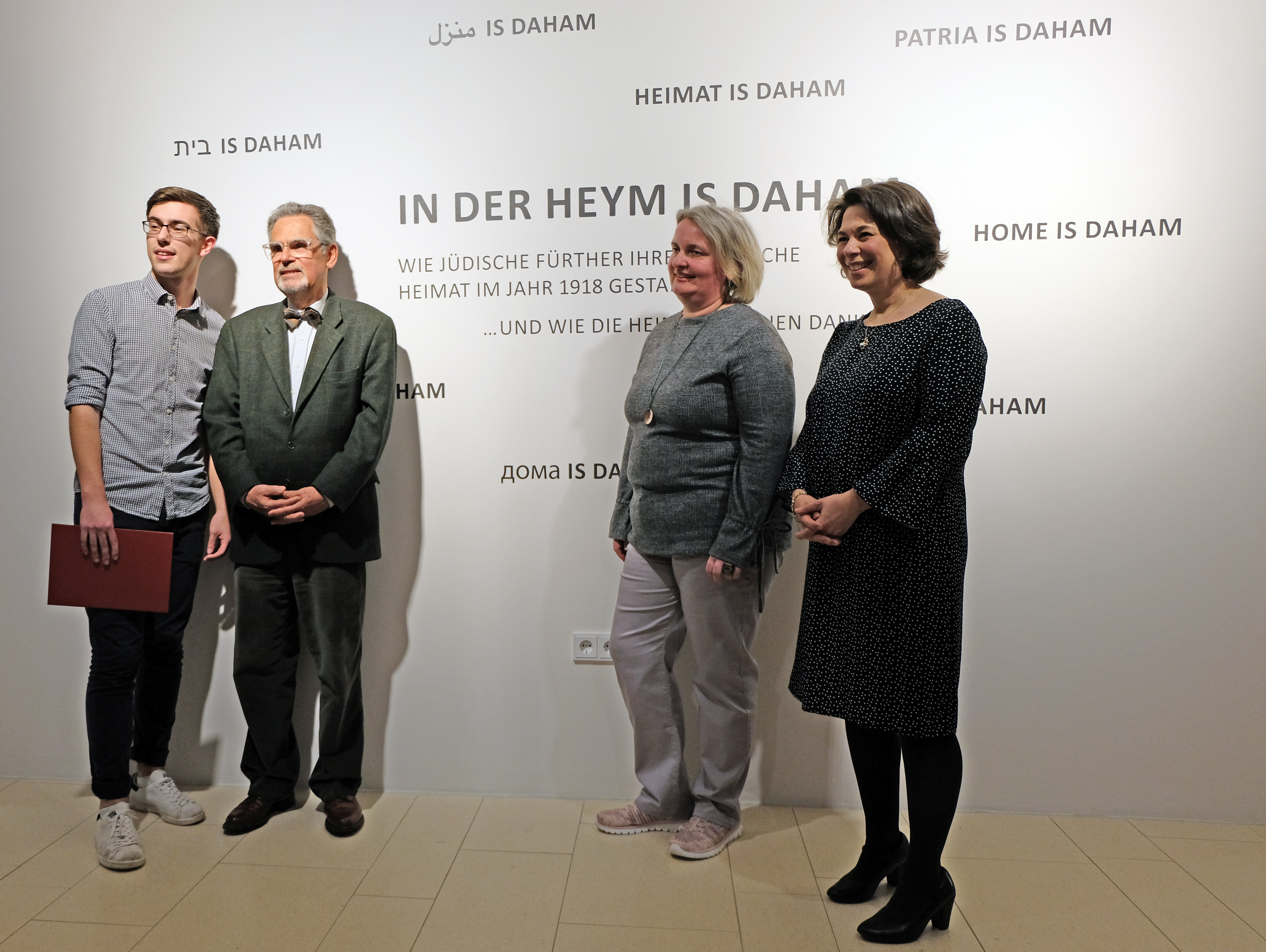 | Beschreibung | v.l.n.r.: Kurator Simon Rötsch, Robert Löwensohns Enkel Robert Vitkine aus Paris, Stadträtin Michaela von Wittke und Daniela Eisenstein bei der Ausstellungseröffnung "In der Heym is Daham" im Jüd. Museum Franken, Mrz. 2019 | ||