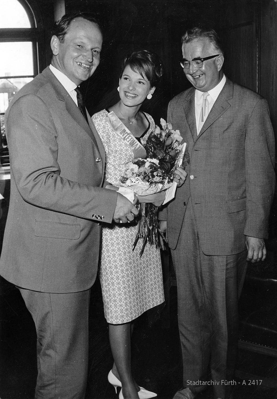 | Beschreibung | Miss-International Ingrid Finger zu Besuch beim Oberbürgermeister Kurz Scherzer und Bürgermeister Heinrich Stranka im Rathaus, 1965 | ||