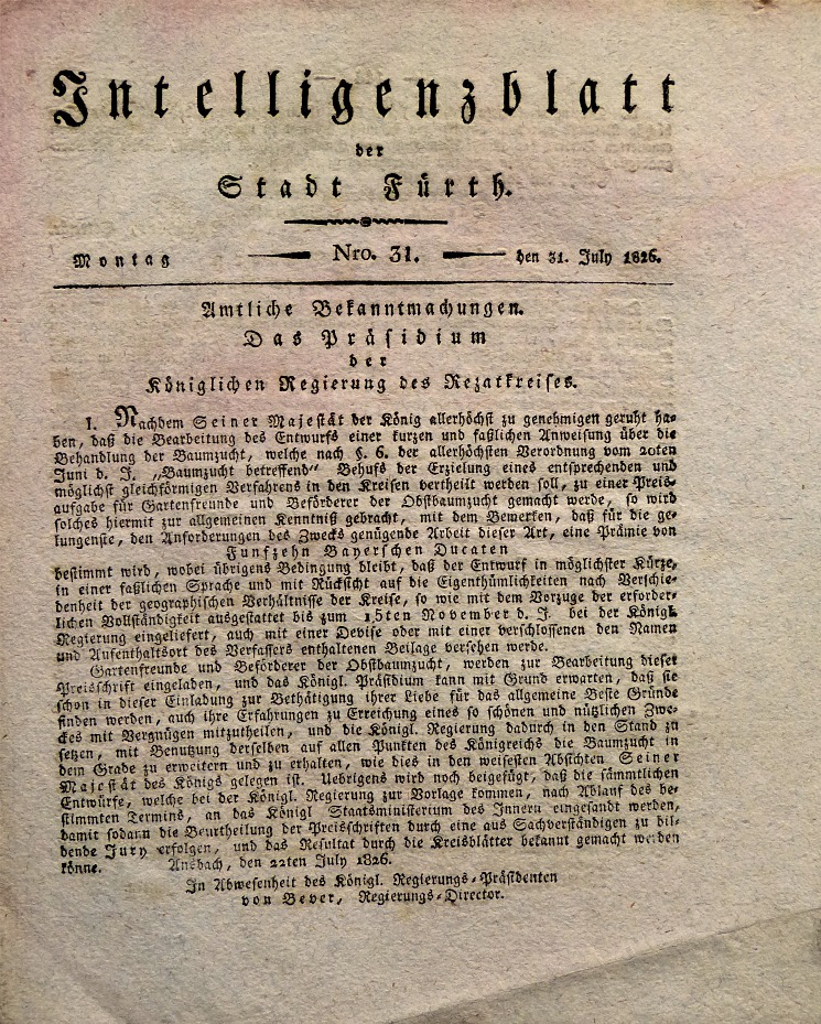 | Dateiinfo (Bild-Unterschrift und Info-Box, automatisch erstellt) | Intelligenzblatt der Stadt Fürth, Juli 1826 Urheber: Stadt Fürth<br>Lizenz: CC BY-SA 3.0 | ||