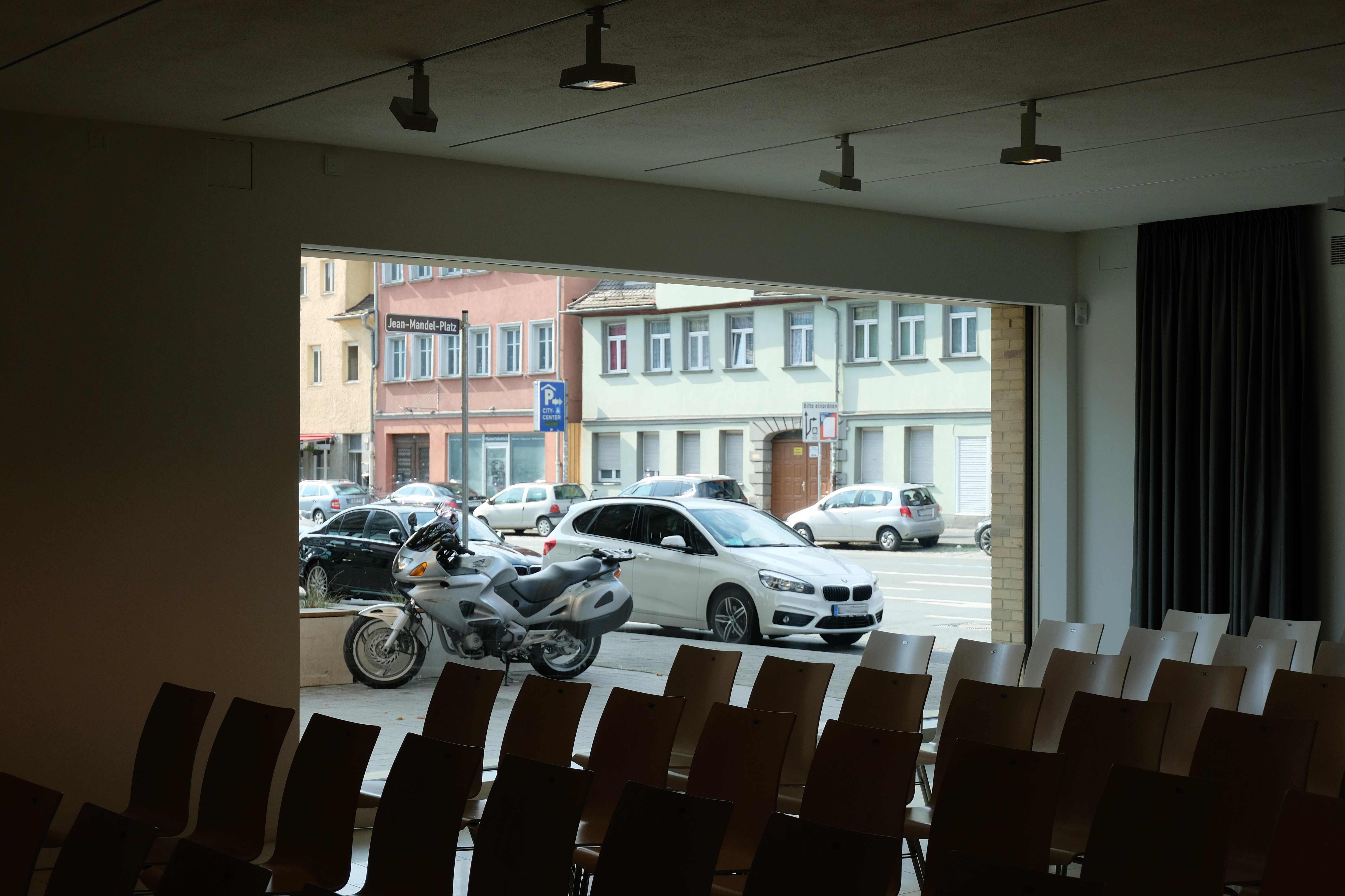 | Beschreibung | Jüdisches Museum Franken, Blick aus dem Vortragssaal auf den Jean-Mandel-Platz, Sept. 2019 | ||