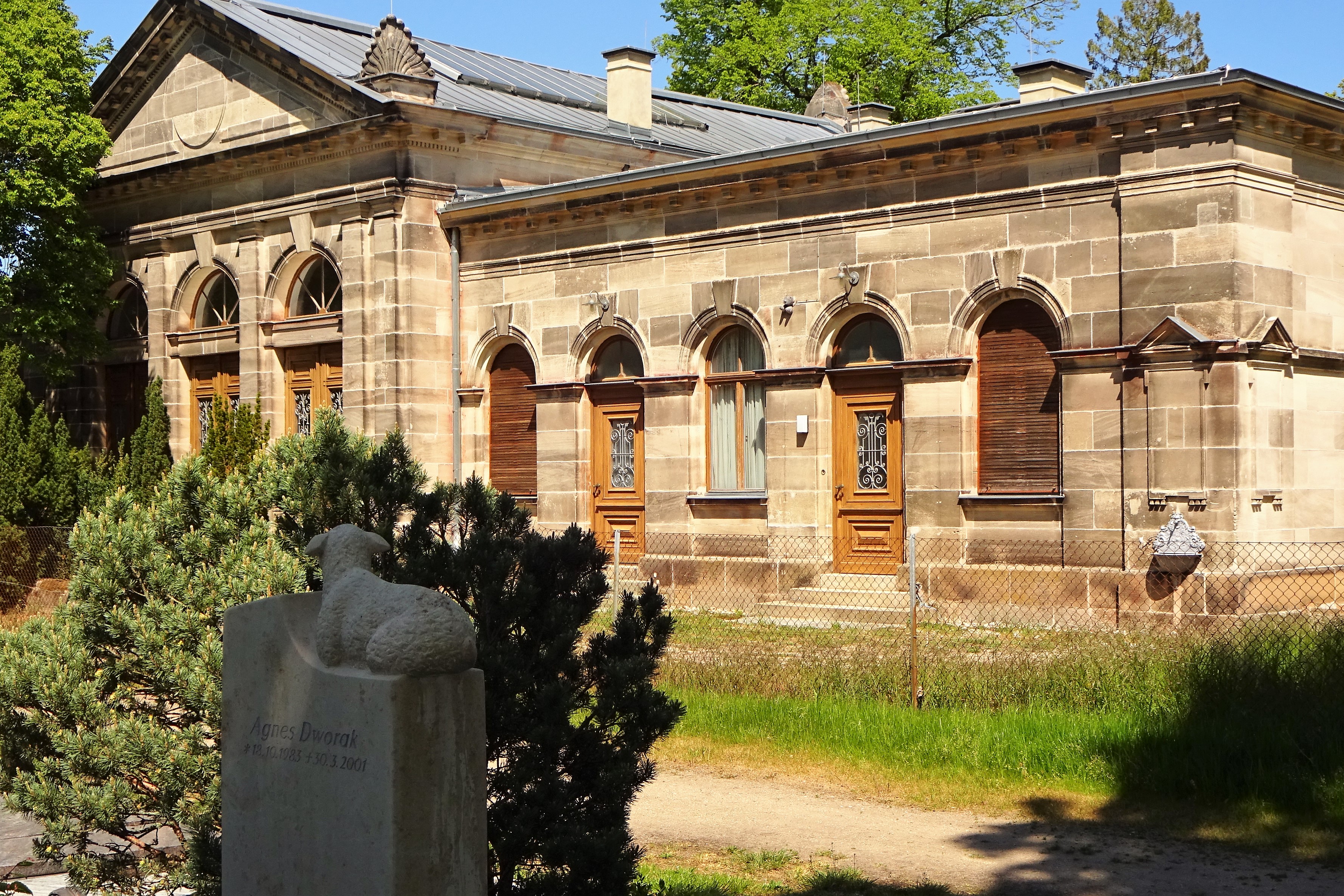 | Beschreibung | Neuer israelischer Friedhof, Leichen- und Wartehalle Rückseite an der Erlanger Straße 99 im Mai 2020. | ||