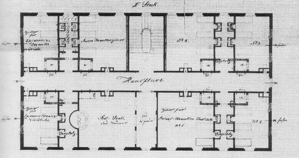 | Dateiinfo (Bild-Unterschrift und Info-Box, automatisch erstellt) | Bauplan Jüdisches Hospital 2. Stock, Konrad Jordan, 1841 Urheber: Konrad Jordan<br><br>Lizenz: CC BY-NC-SA 3.0 | ||