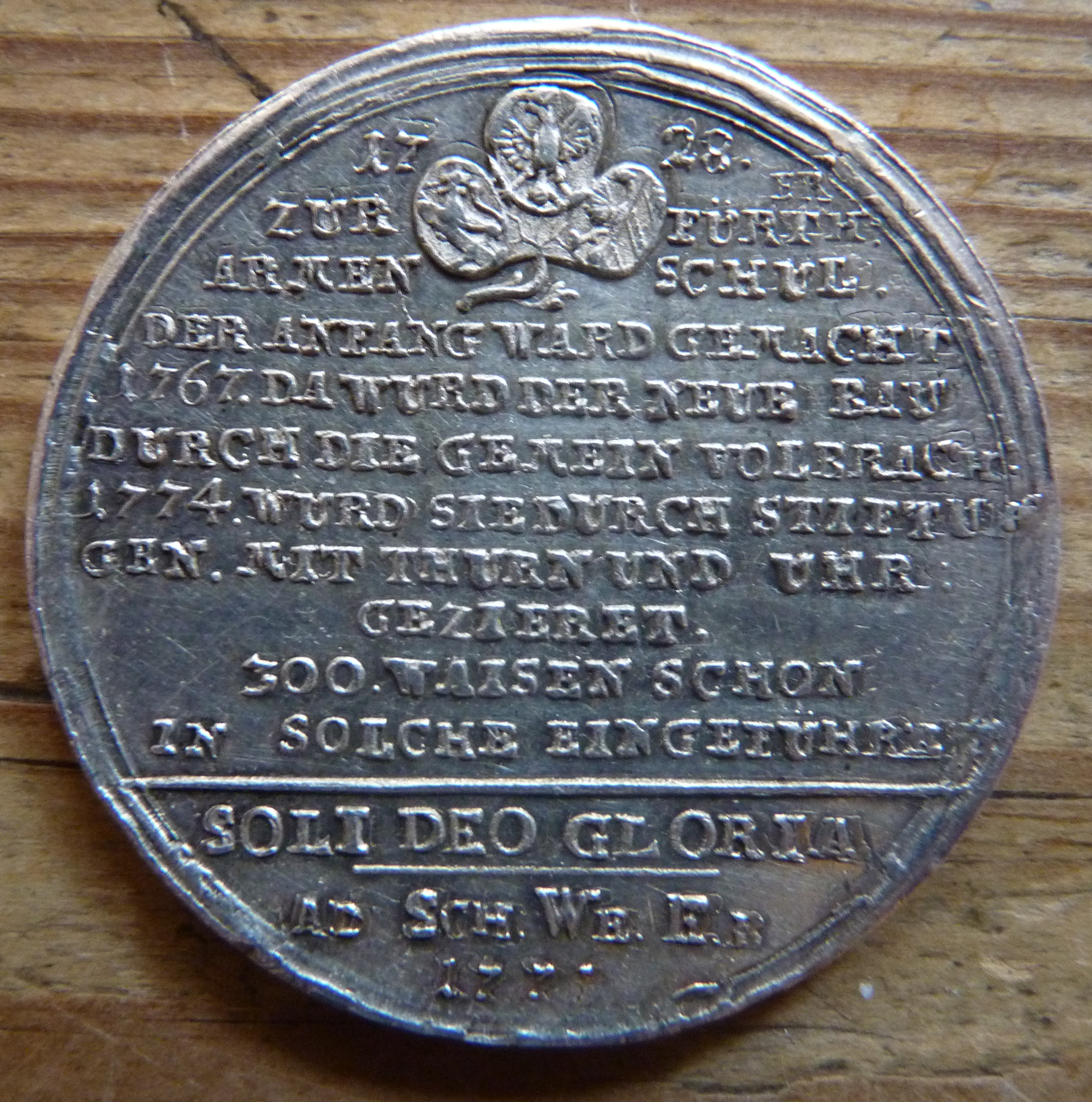 | Dateiinfo (Bild-Unterschrift und Info-Box, automatisch erstellt) | Zinnmedaille zur Einweihung der Fürther Armen- und Waisenschule von J. C. Reich, Revers Urheber: Chrischmi<br><br>Lizenz: CC BY-SA 3.0 | ||