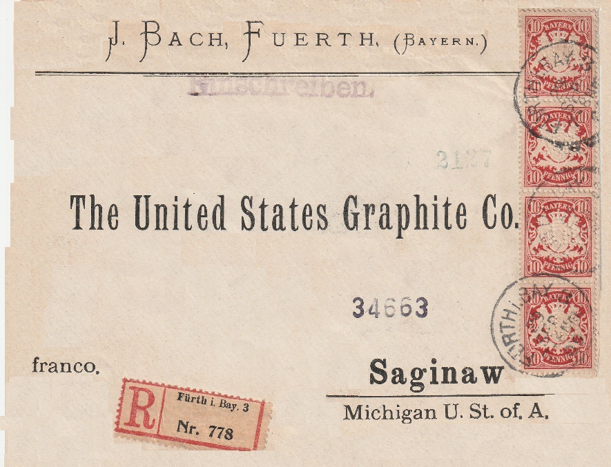 | Dateiinfo (Bild-Unterschrift und Info-Box, automatisch erstellt) | Einschreiben Firma J. Bach, 1909 Lizenz: CC BY-NC-ND 4.0 | ||