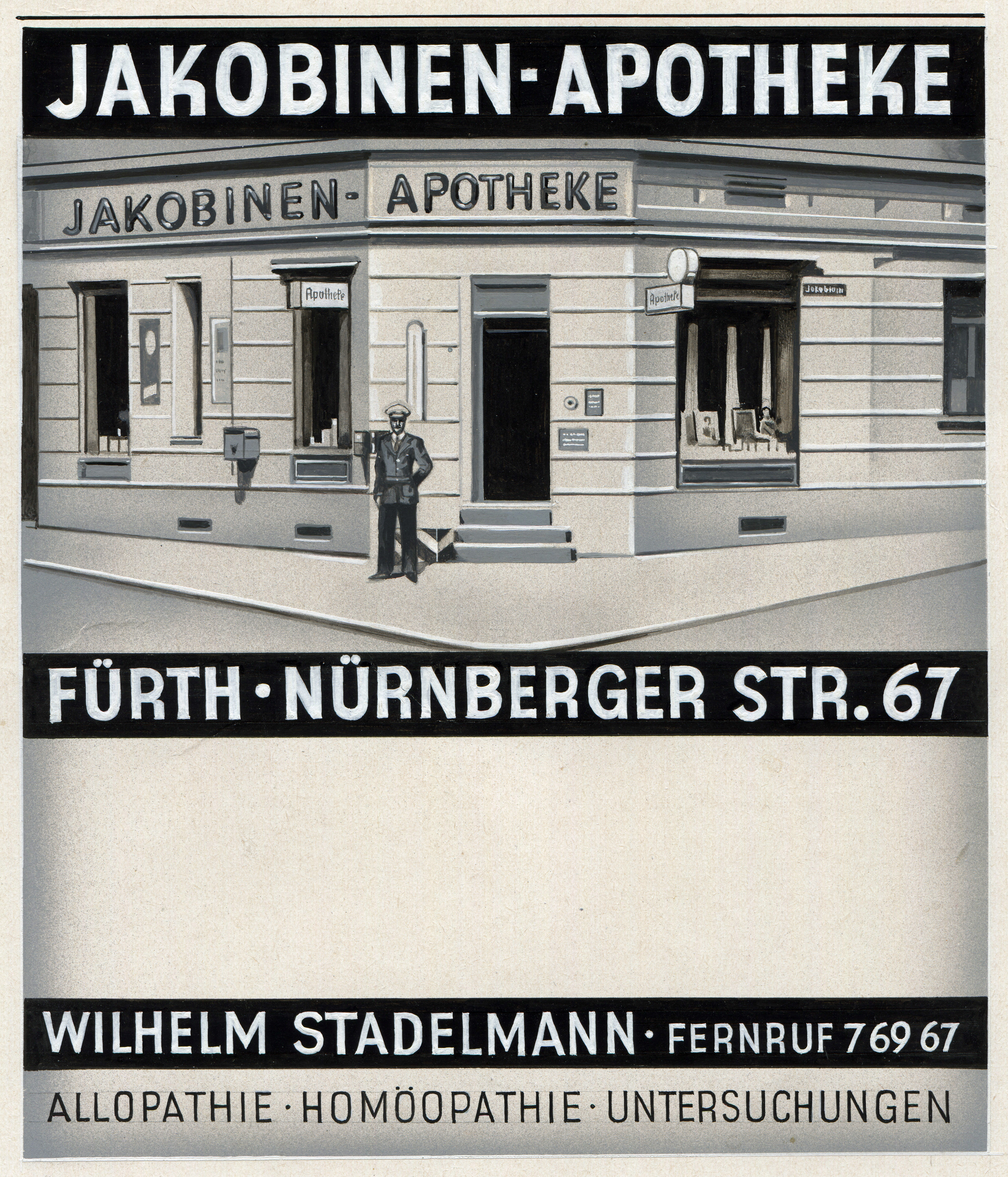 | Beschreibung | Druckvorlage einer Anzeige der Jakobinen-Apotheke in der Nürnberger Straße, ca. 1950 | ||