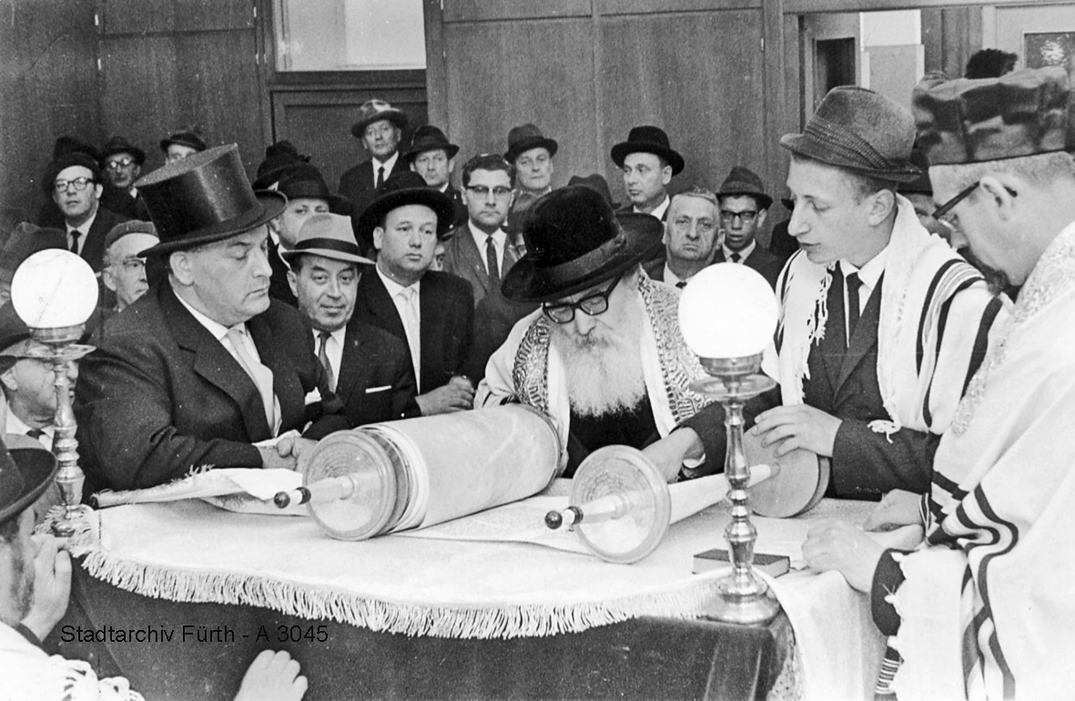 | Beschreibung | Jean Mandel (links mit Zylinder), Vorsitzender der Israelitischen Kultusgemeinde Fürth, Rabbiner David Spiro (Bildmitte) und dessen späterer Biograph Moshe Nathan Rosenfeld (2.v.r.) beim Gottesdienst in der neuen Synagoge, 1968 | ||
