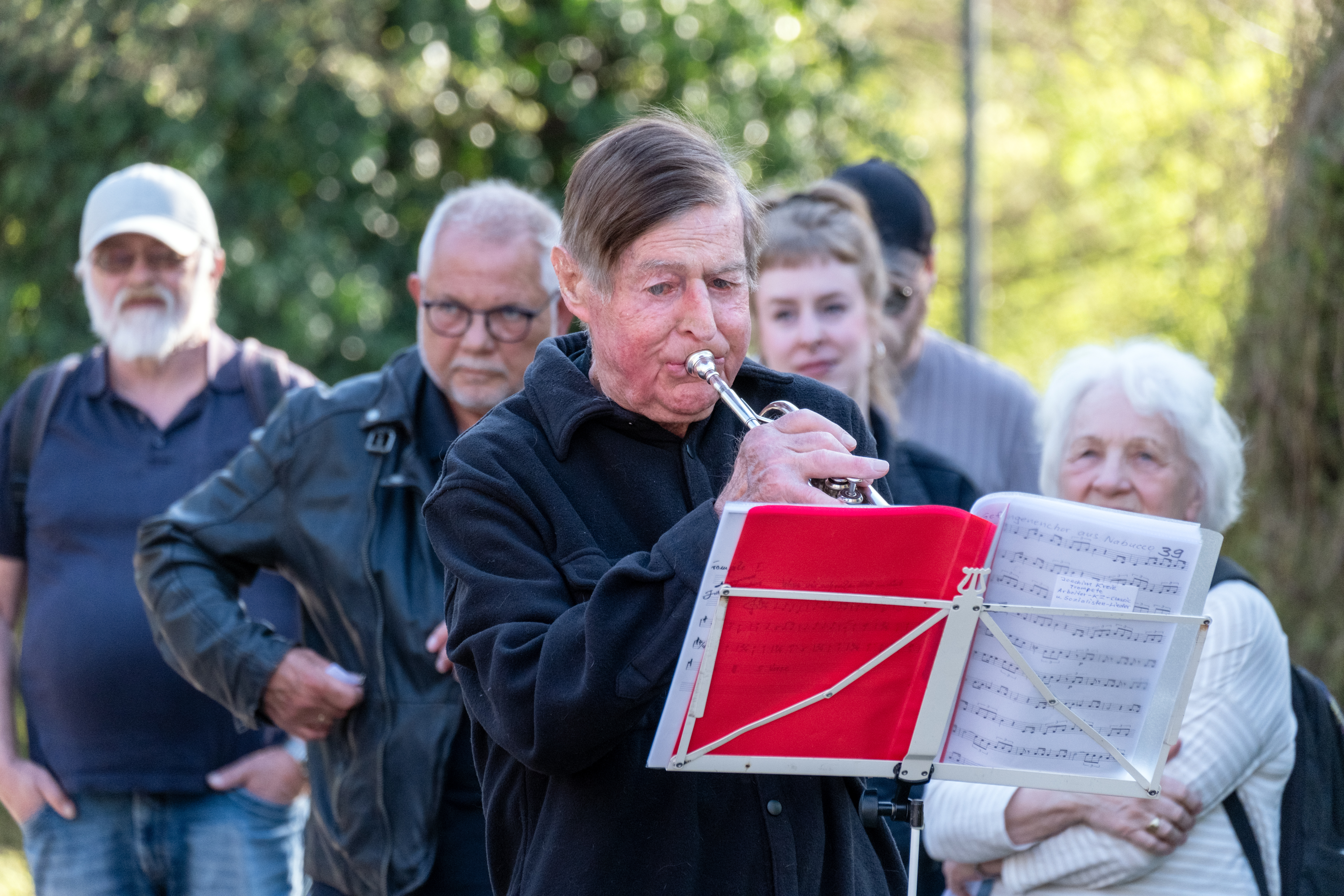 | Beschreibung | Trompeter Joachim Kreie bei der Gedenkveranstaltung der ermordeten Benario und Goldmann an der Uferpromenade, April 2025 | ||