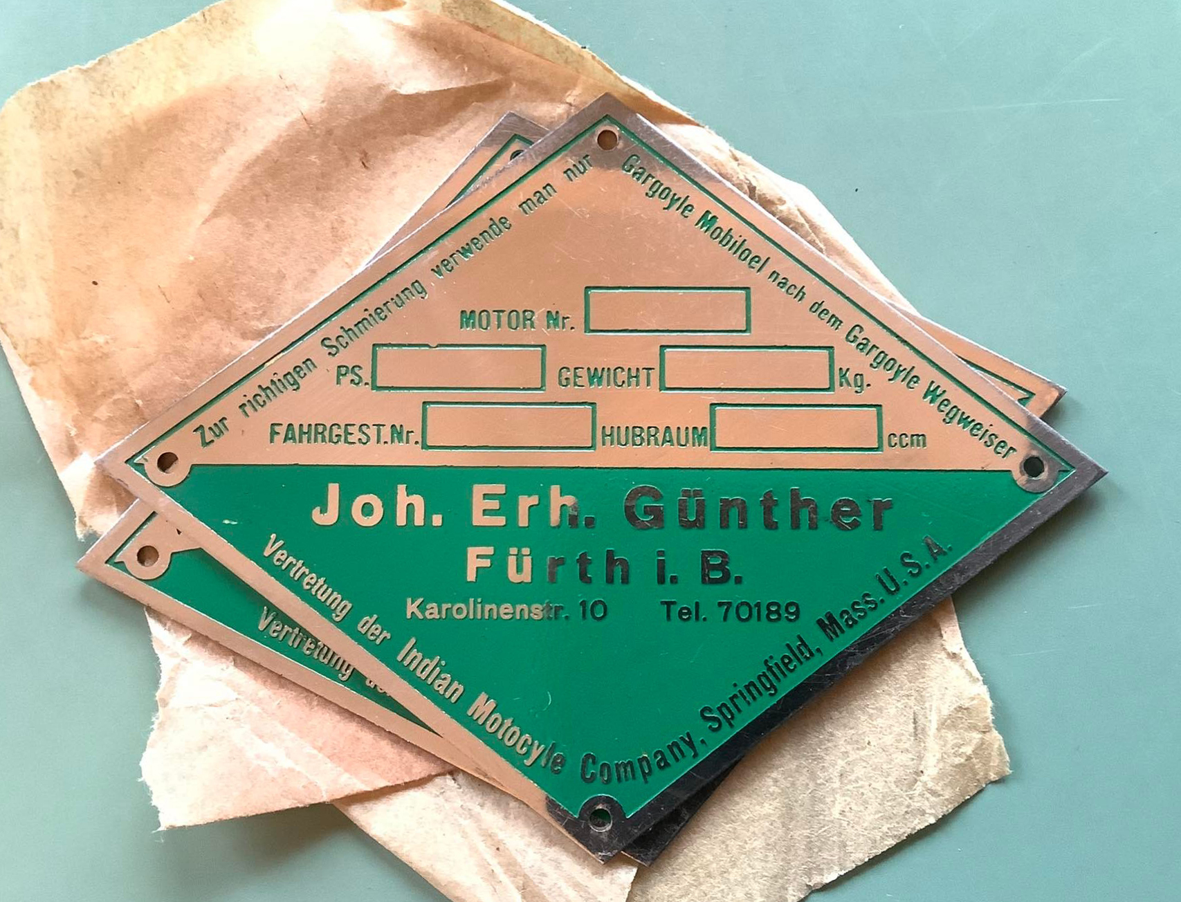 | Beschreibung | Typenschild für Motorräder, die im Hinterhaus Karolinenstraße 10 von der Fa. Joh. Erh. Günther gebaut und/oder vertrieben wurden. | ||