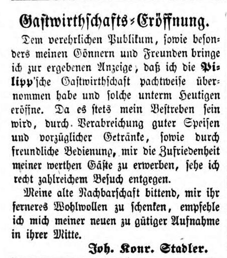 | Dateiinfo (Bild-Unterschrift und Info-Box, automatisch erstellt) | Joh. Konr. Stadler übernimmt die Pilipp´sche Gastwirthschaft, August 1855 Lizenz: NoC-NC 1.0 | ||