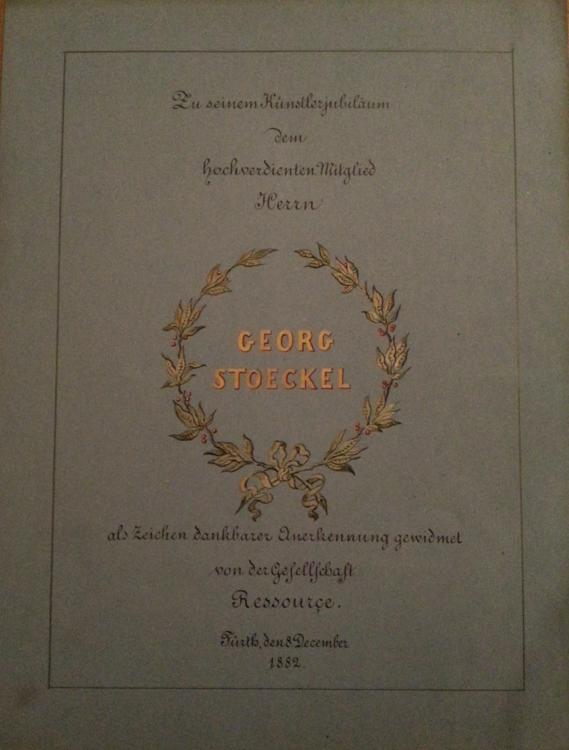 | Beschreibung | Ehrung für das "hochverdiente Mitglied" Georg Stoeckel der Künstlergesellschaft "Ressource", Dezember 1882 | ||