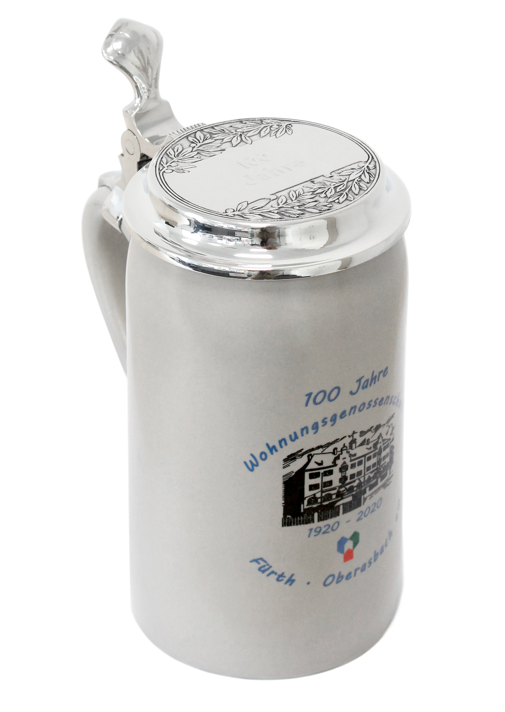 | Beschreibung | Neuer 0,5 l-Steinzeugkrug zum 100jährigen Jubiläum der Wohnungsgenossenschaft Fürth-Oberasbach im Jahr 2020. Auflage 250 Stk., davon 10 mit einem dem Original nachempfundenen Zinndeckel | ||