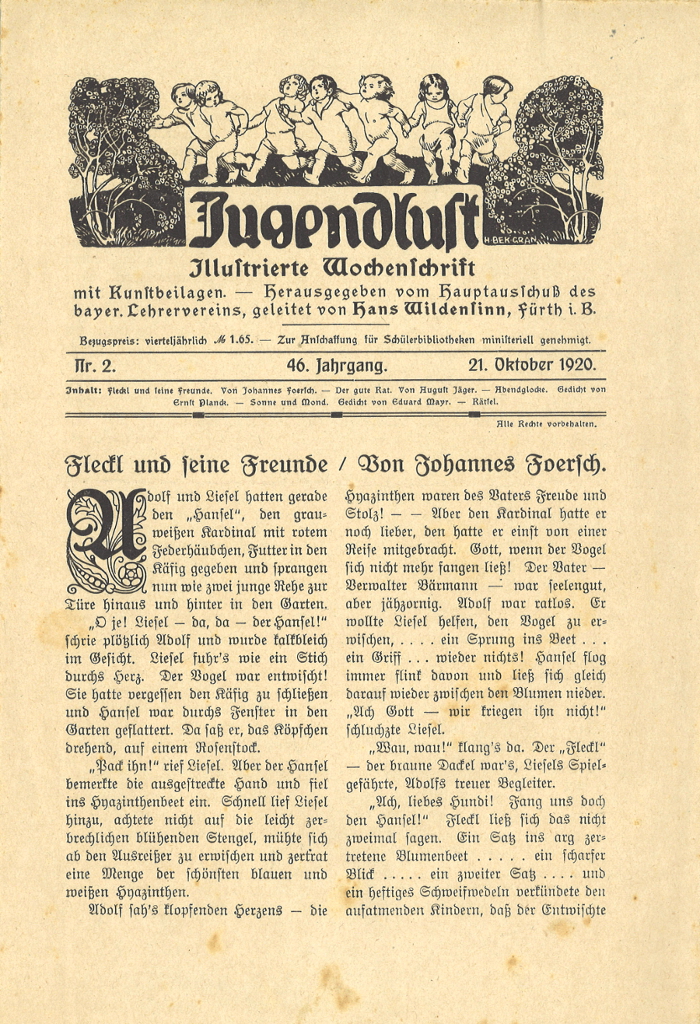 | Beschreibung | Titelseite der "Jugendlust", Ausgabe Oktober 1920, Nr. 2. Schriftleiter: Hans Wildensinn | ||
