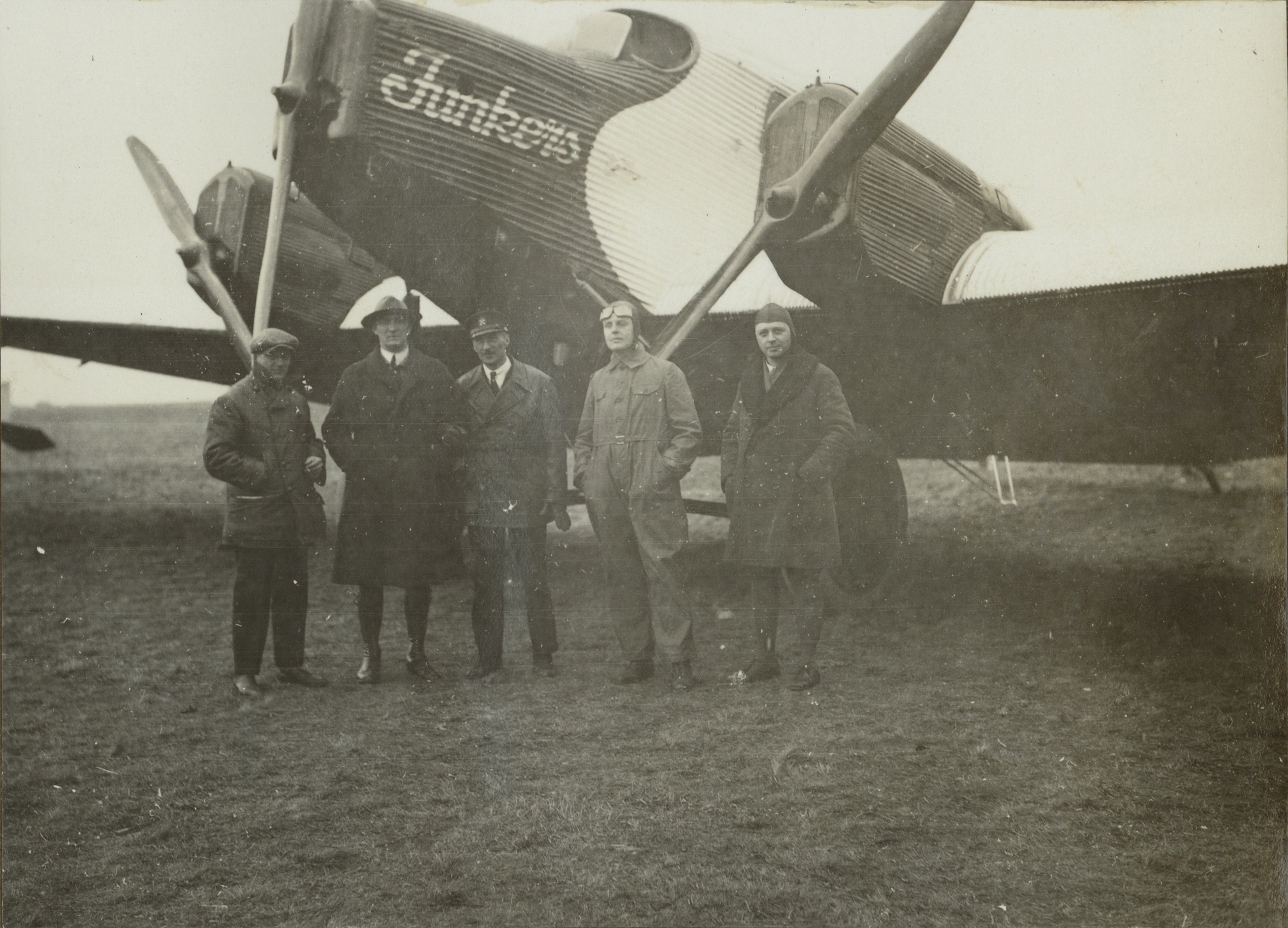 | Beschreibung | Foto "Auf der "Grossflugzeugschule" Flugplatz Fürth"; Flugzeugführer Peter Wagner, Rudolf Krause, Hermann Röder, Otto Brauer u. unbekannt (Aufnahme 1917-1925) | ||