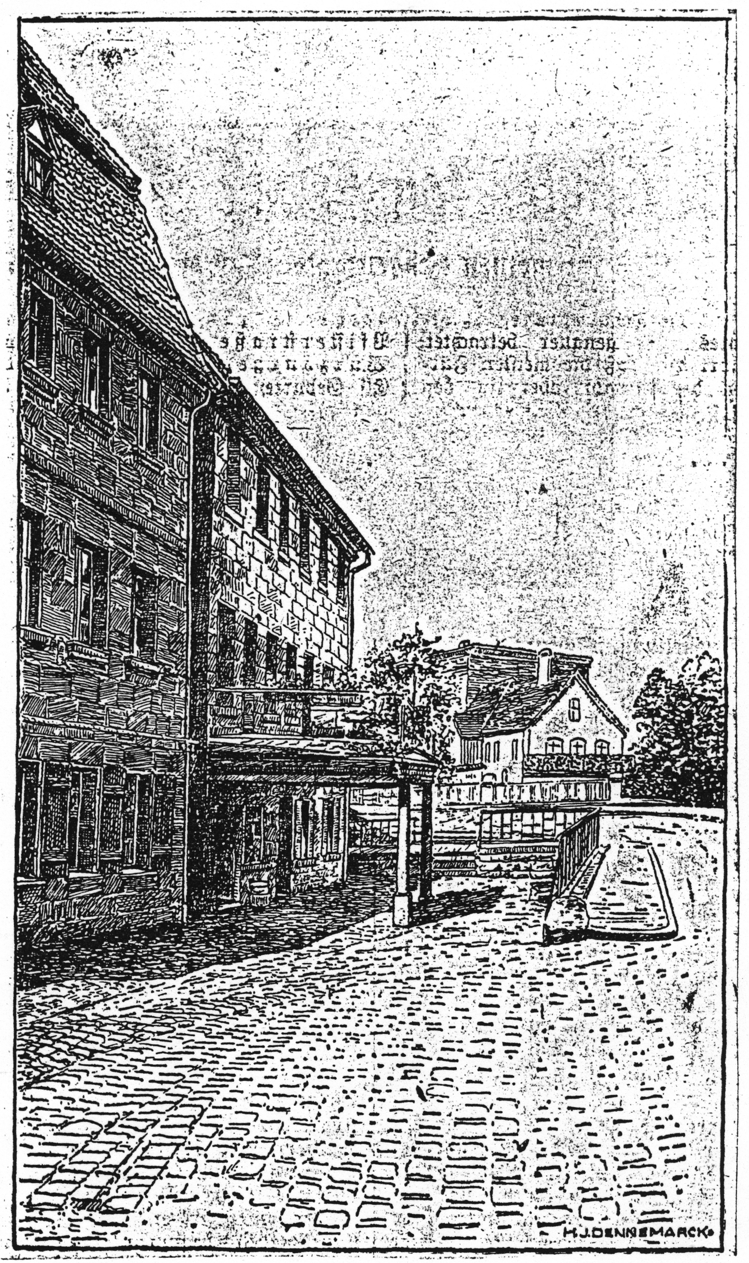 | Beschreibung | Die Schmiede in der Königstraße 2 – Zeichnung: H. J. Dennemarck, 1939 | ||