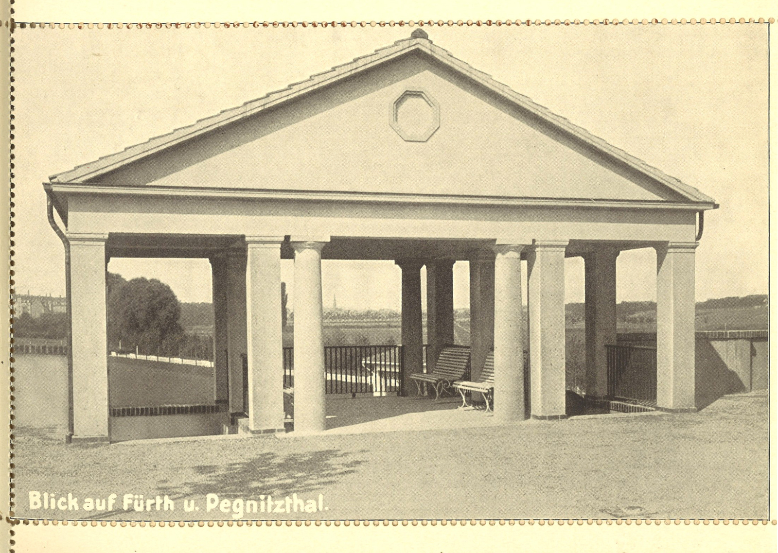 | Beschreibung | Aussichtstempel im Kurgarten, Oberseite mit Blick auf die Pegnitz, historische Postkarte, um 1913 | ||