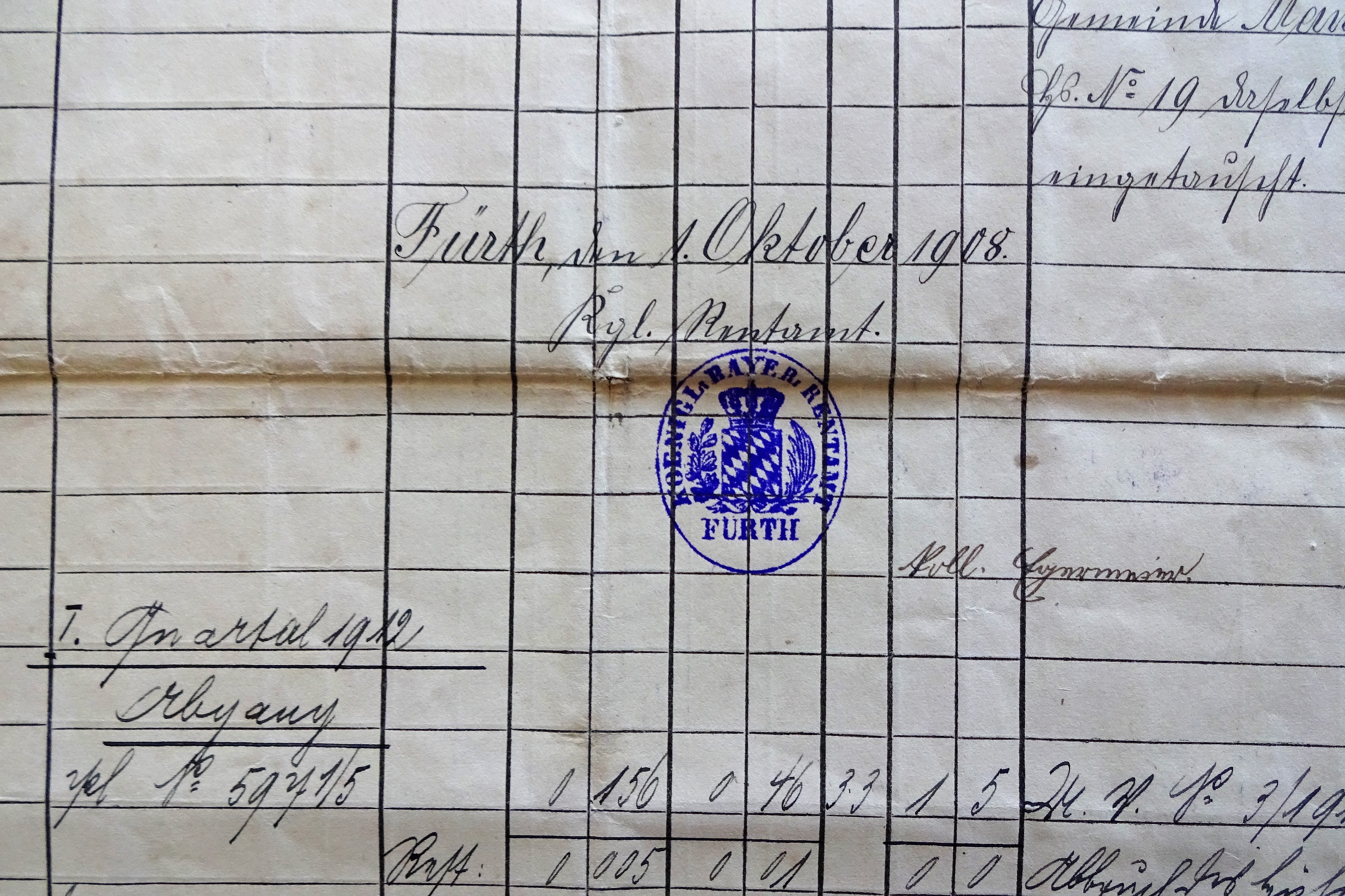 Ausschnitt eines amtlichen Dokumentes mit Dienstsiegel des "Königlichen Bayerischen Rentamt Fürth" von 1908