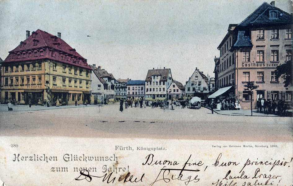 | Beschreibung | Der Königsplatz, um die Jahrhunderwende. Rechts am Bildrand die Gaststätte Zu den Drei Königen. AK gelaufen 1900 nach Neapel (Italien) | ||