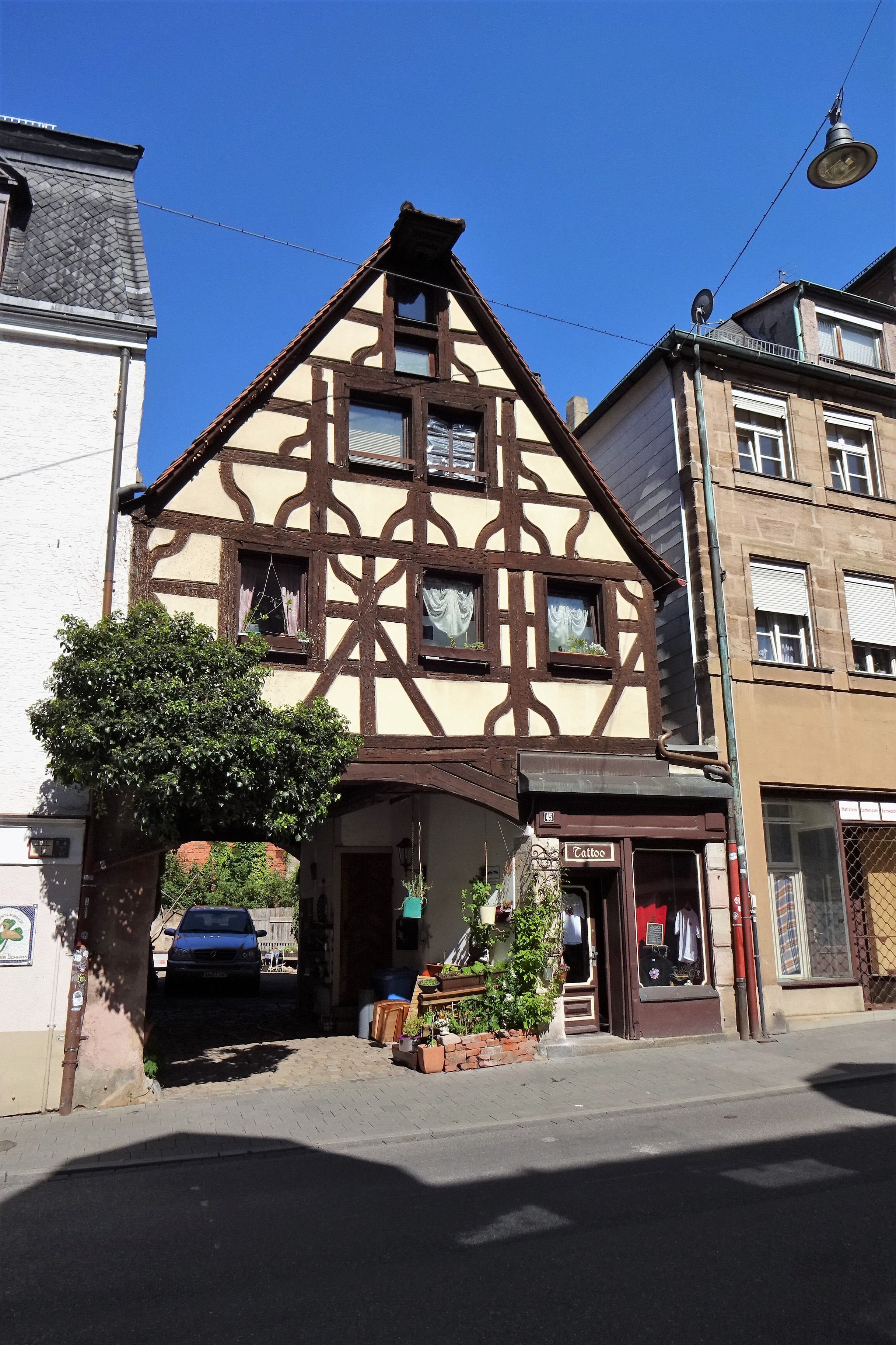 Gebäude Königstraße 45 im Mai 2020 mit Toreinfahrt u. a. Zum Goldenen Schwan. Genau gegenüber der Königstraße war das Eingangstor zum zerstörten, früheren Synagogengelände mit Schulhof und Synagoge.