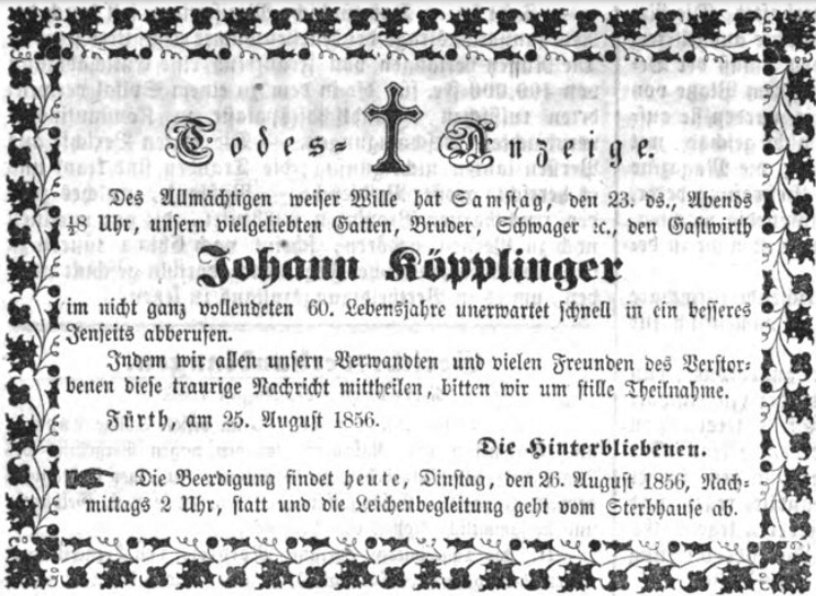| Beschreibung | Todesanzeige Johann Köpplinger, August 1856 | ||