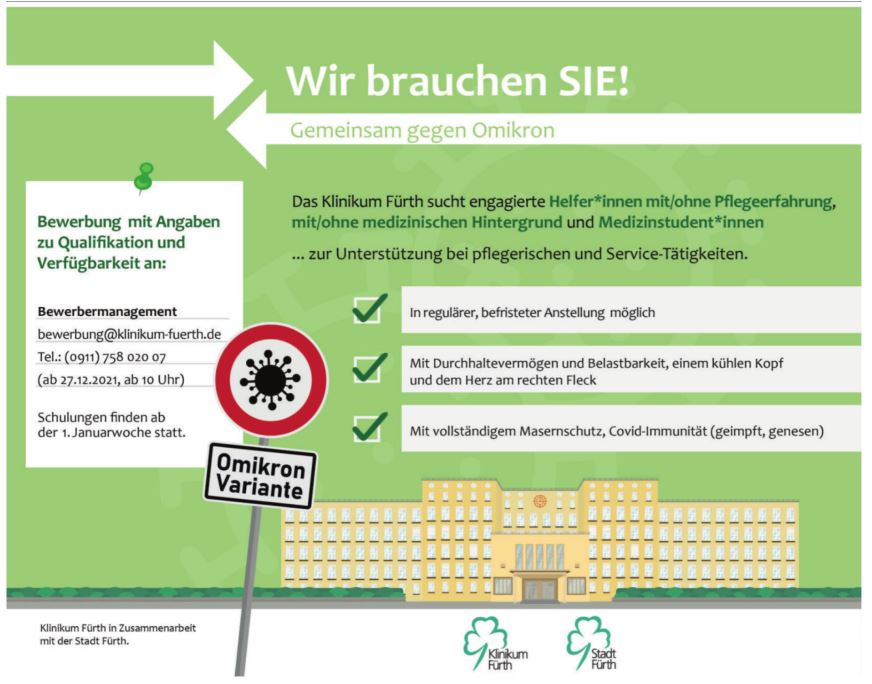 | Beschreibung | Anzeige des Klinikum Fürth - Aufruf zur Unterstützung vor der nächsten Welle, der sog. Omikron-Varianten-Welle, Dez. 2021 | ||